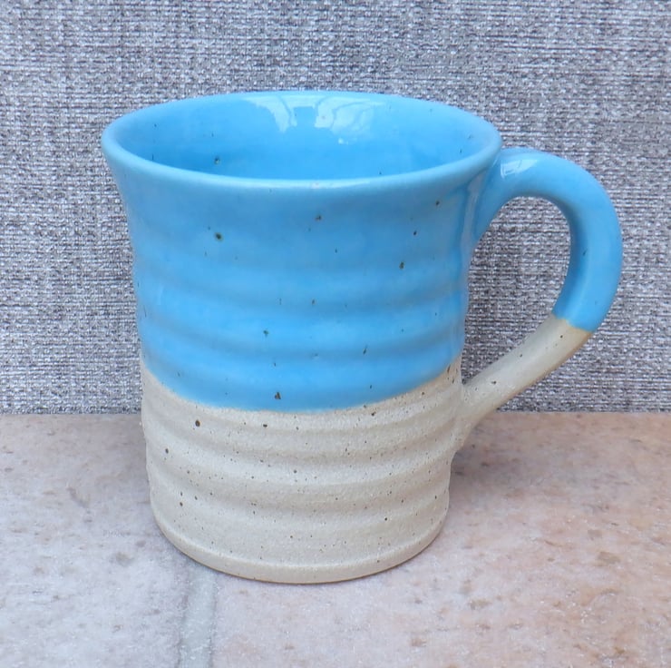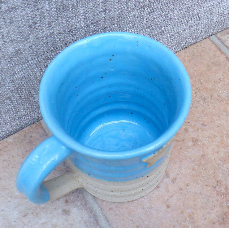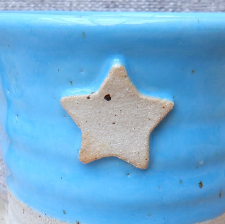 I threw this mug on my pottery wheel using strong off-white stoneware clay, with a distinct speckle, added a little star stamp, and finished it in a pretty turquoise aquamarine reactive glaze.