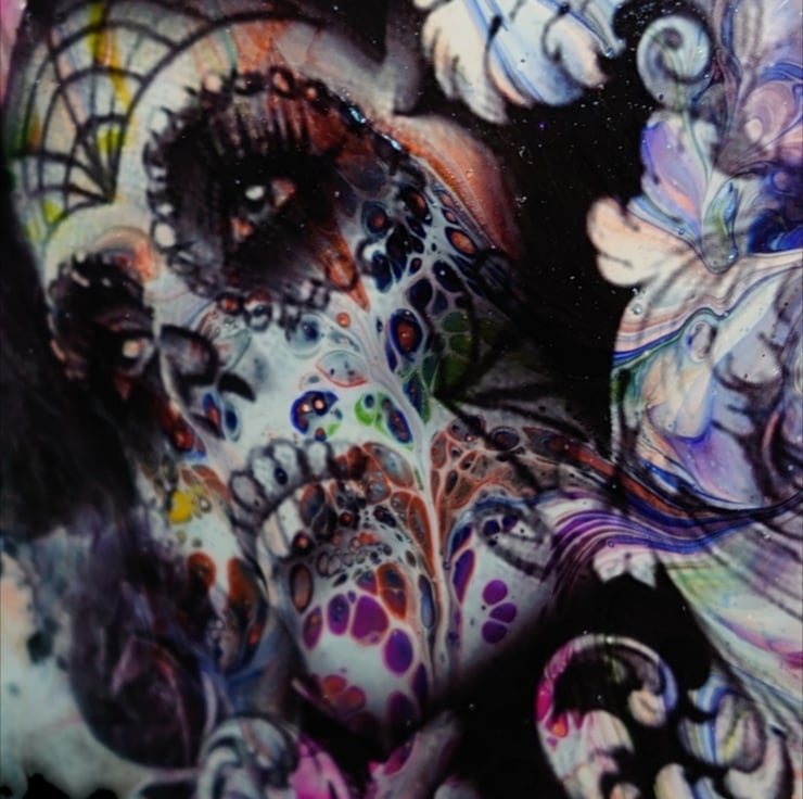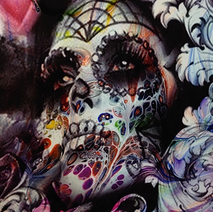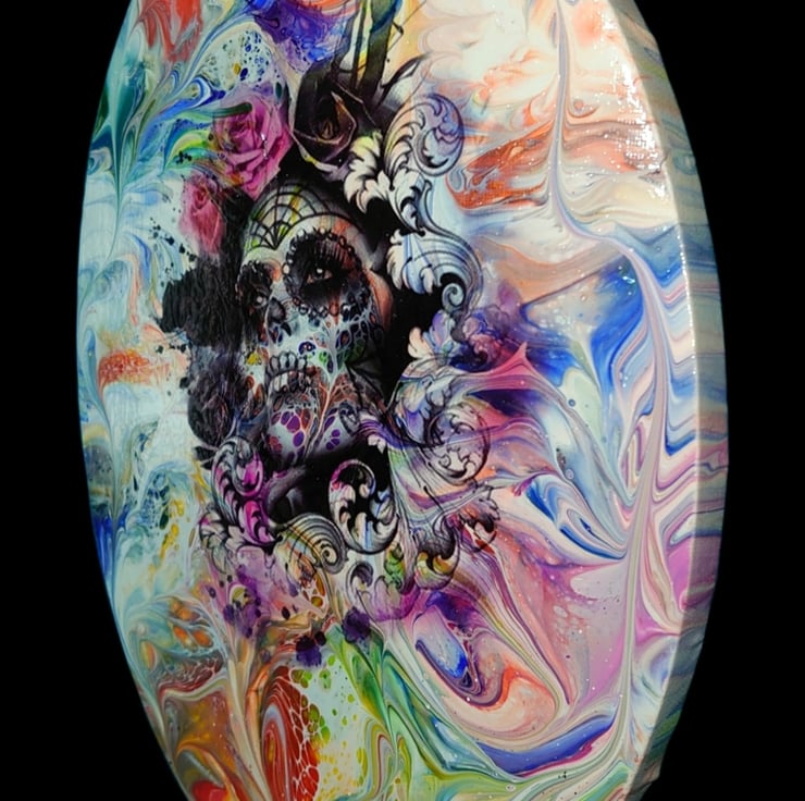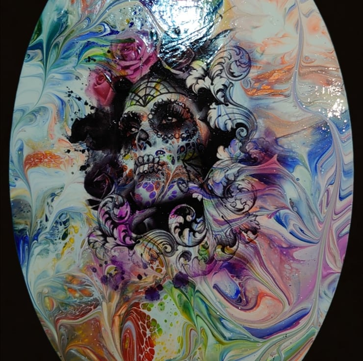 This is a 30cm X 20cm oval stretched canvas with an acrylic fluid art painting, embellished with a beautiful death rose skull lady.