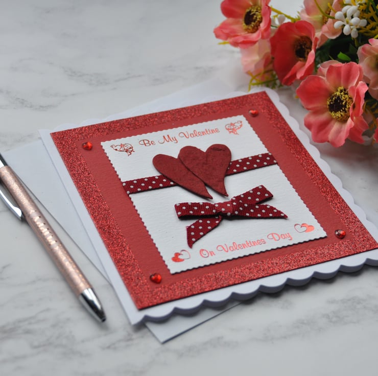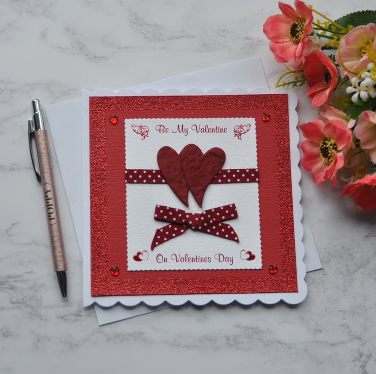 This design is two of my red handmade love hearts resting on a red and white polka dot ribbon. The sentiment greeting is red foiled and says Be My Valentine On Valentines Day. The card is finished with a matching ribbon bow, lots of red glitter, and red love heart gems.