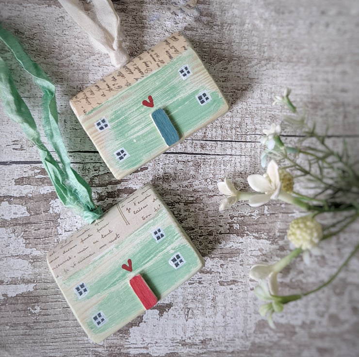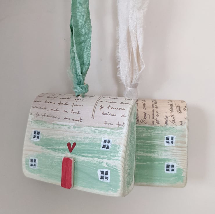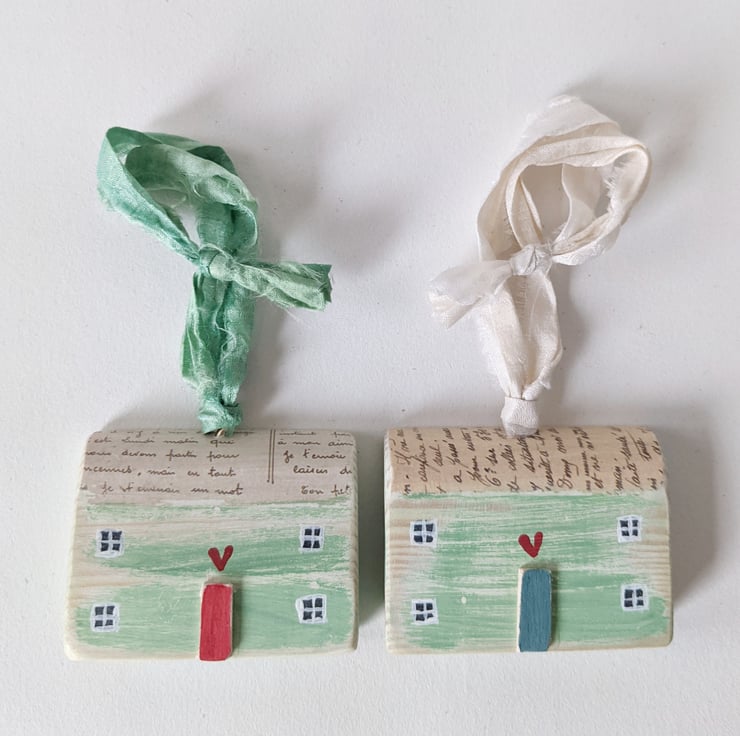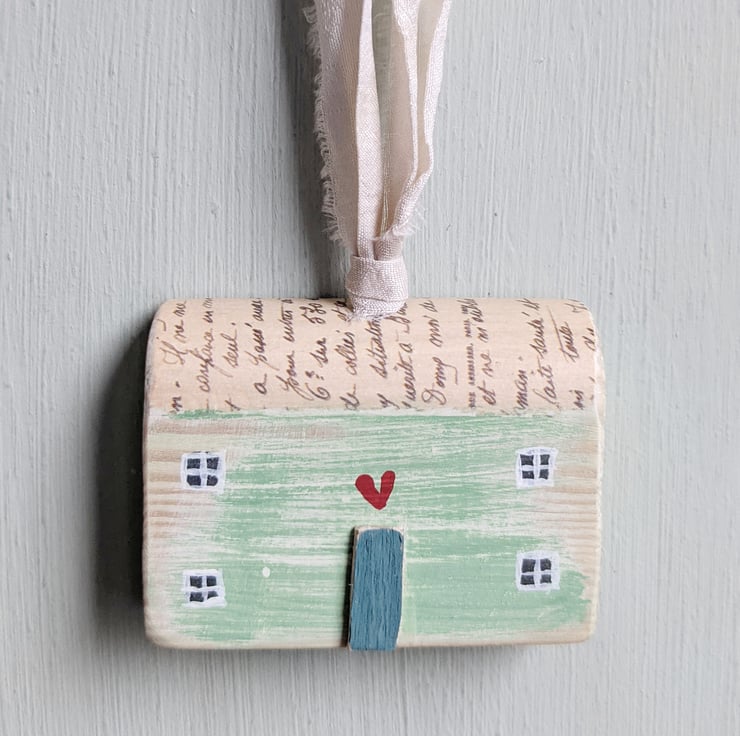 Hand painted with teeny windows and door this one of a kind house hangs on recycled sari silk ribbon.