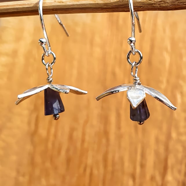 Fine silver flowers with iolite trumpets on sterling silver ear wires.