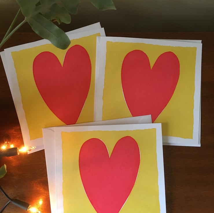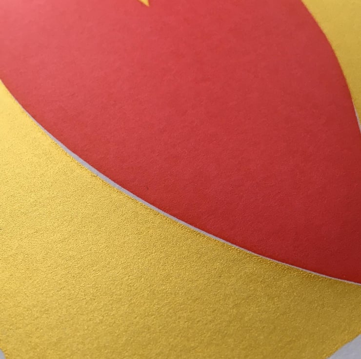 Handmade limited edition, silkscreen printed card. Red heart on gold background. Only 11 printed in this edition.