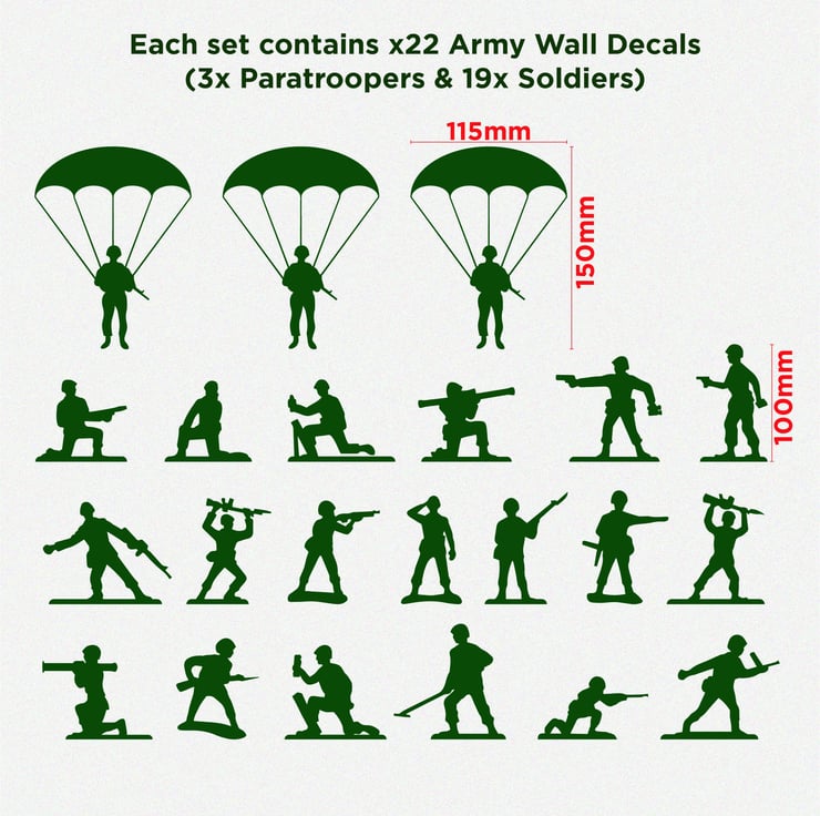 Within our sticker pack you will receive x22 stickers in total - x3 Paratroopers & x19 Soldiers.