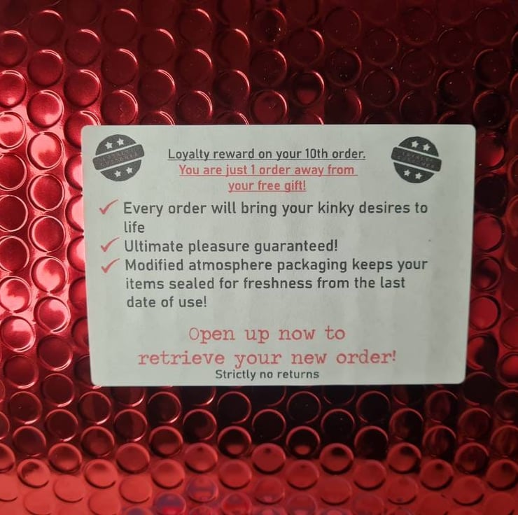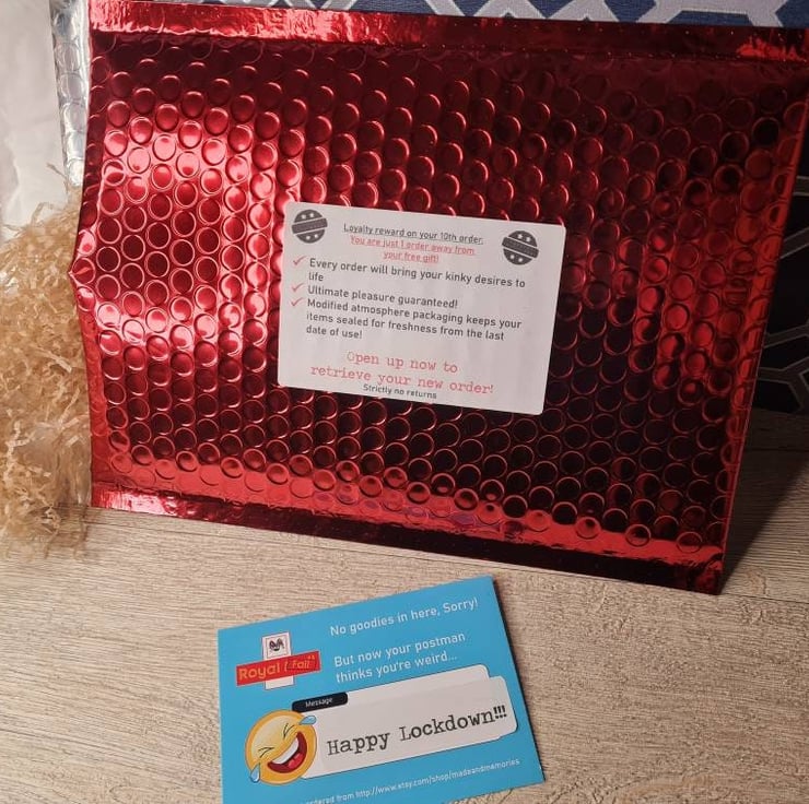 comes in a extremely a loud and bold metallic bubble envelope with a realistic looking address label to the front. On the rear is another realistic looking bogus label. Inside the envelope is stuffed with shredded paper to give the feel of contents and contains a note card explaining the prank with a choice to leave a note from yourself! that's if you want to be revealed as the perpetrator... On the back of the envelope, hanging out of the seal is a piece of string to give the impression there is a tampon inside.