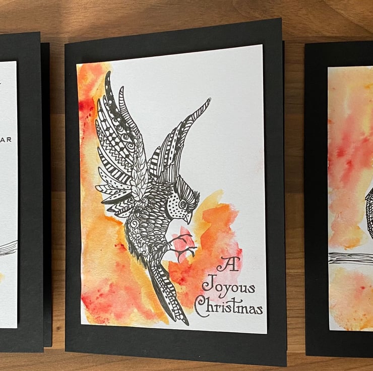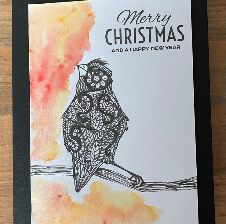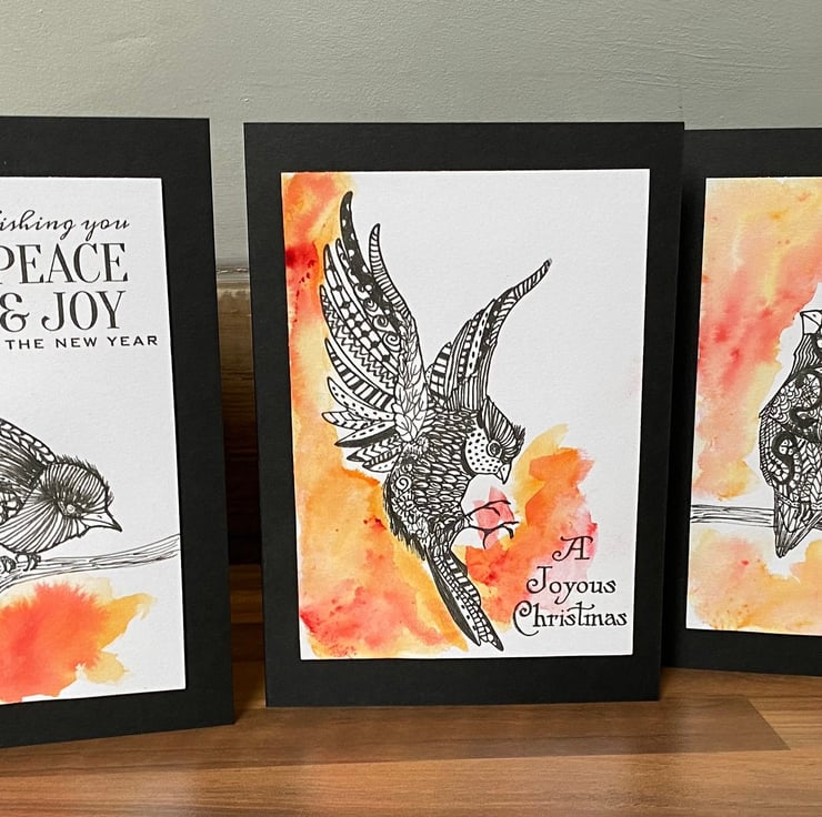 The background has been coloured using Brusho watercolour powder in Crimson and Orange which makes the Birds bring Christmas Cheer to each recipient.