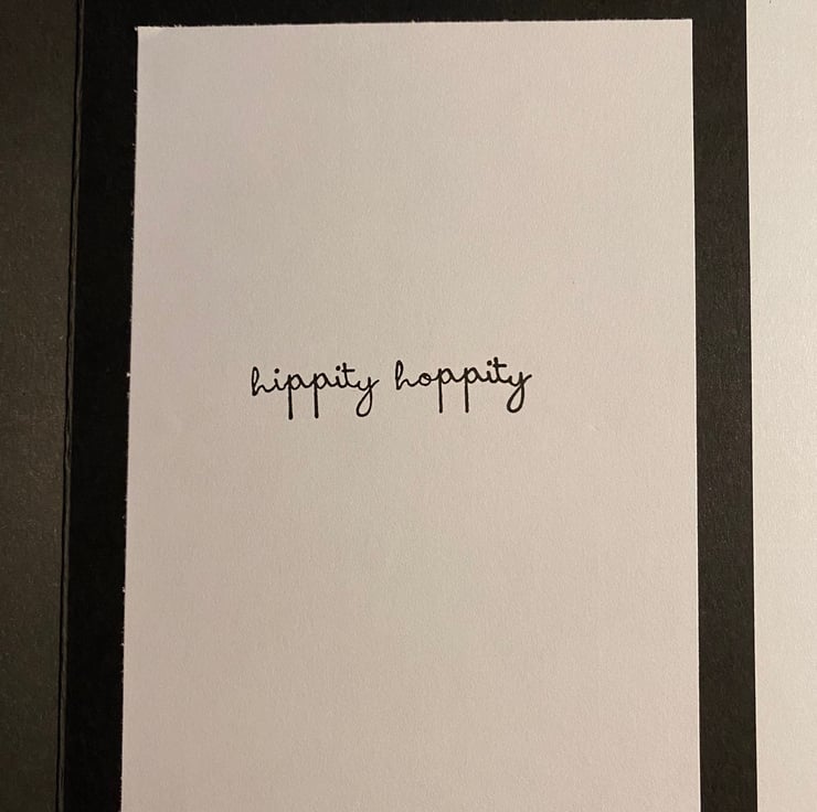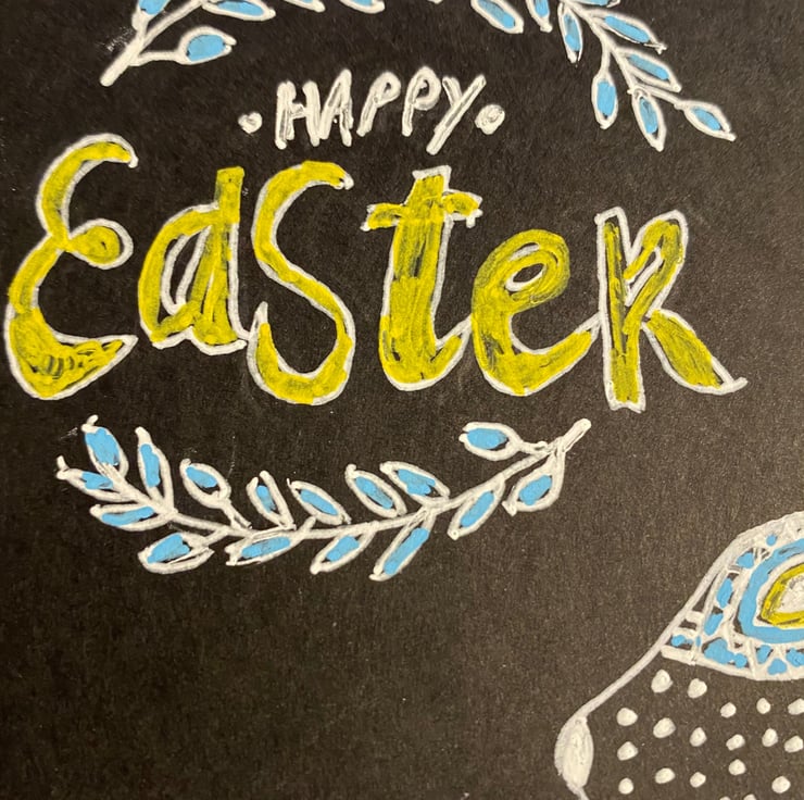I drew the outline from a negative die-cut using a white gel pen and then doodled the body with the same pen. The rabbits were then coloured using Yellow and Light Blue Posca Paint pens to add some springtime elements
