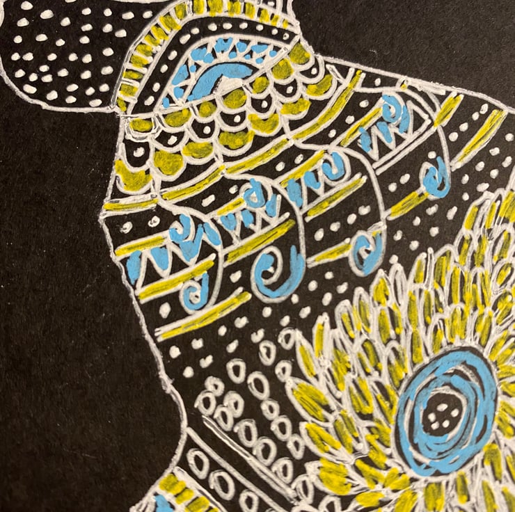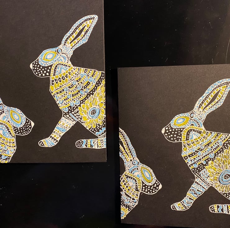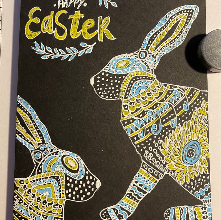 I drew the outline from a negative die-cut using a white gel pen and then doodled the body with the same pen. The rabbits were then coloured using Yellow and Light Blue Posca Paint pens to add some springtime elements.