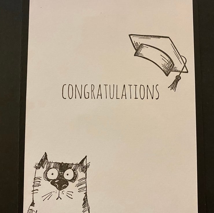 I decided to turn this card into a comedy card; using the larger tortoiseshell cat slipping down the card as if to knock the mortarboard off the other serious faced cat.