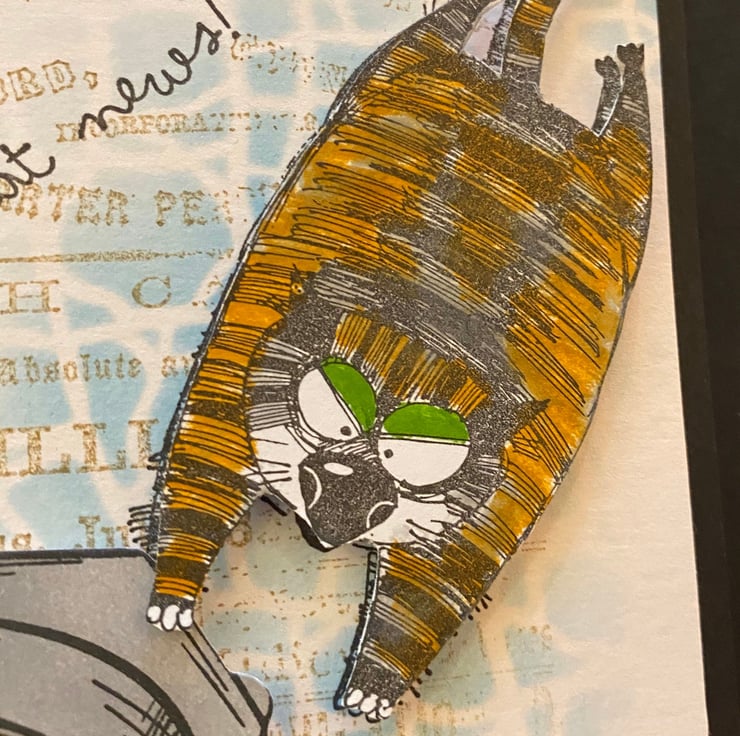This card was designed using Tim Holtzs Snarky Cat stamp set. The cats have been stamped, coloured using Zig Clean Colour Brush Pens snd fussy-cut.