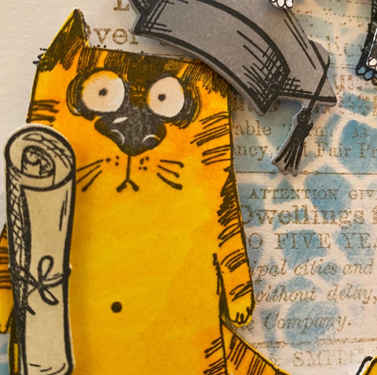 The card background was created using a text stamp and then over that a crackle stencil with Broken China Distress Ink. The cats were stamped directly onto the card and the fussy-cut versions mounted on top to add dimension. Both the mortarboard and scroll were stamp, coloured and die-cut.