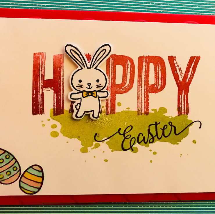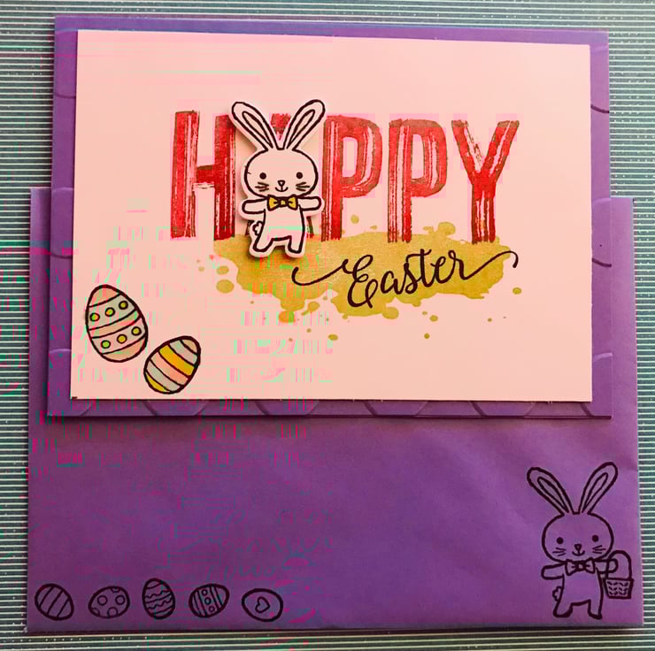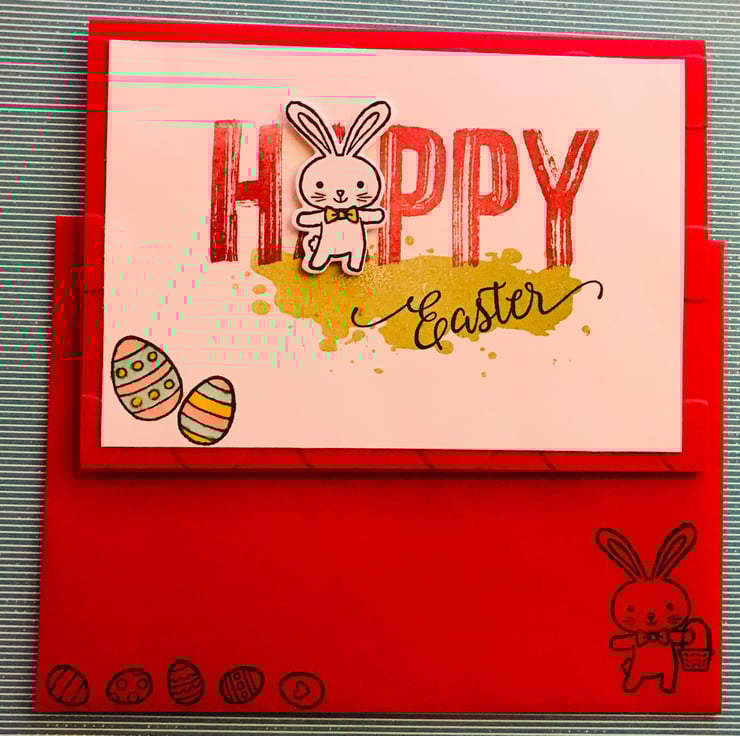 "Happy Easter" sentiment stamped onto card front with die-cut rabbit replacing the letter "A"