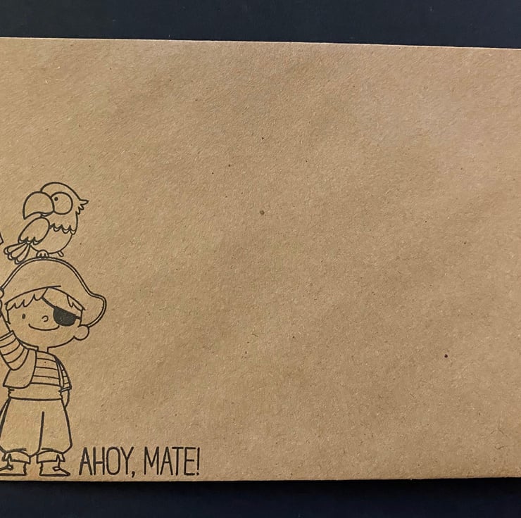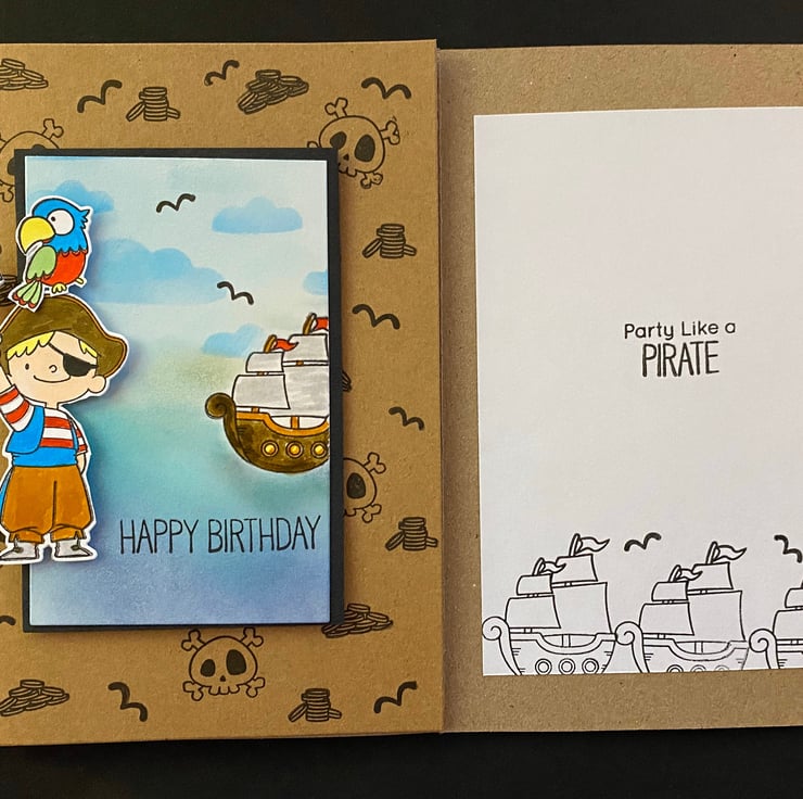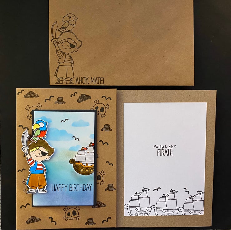The background was created by stamping the ship and ink blending the sea and sky using Distress Oxide inks in Faded Jeans, Mermaid Lagoon, Broken China and Tumbled Glass. The sky has stencilled clouds. The pirates have been adhered to the card front using foam squares. The Kraft card has been pattern stamped in ships, palm trees, birds, treasure and skull and cross bones all in black archival ink. The envelopes have been stamped with one of the pirates and Ahoy Mate! sentiment in black archival ink.
