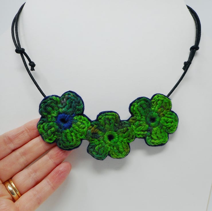 Crochet flower necklace in green and blue