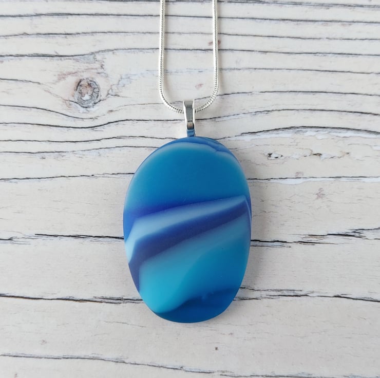 A lovely smooth glass pebble pendant with bands of watery turquoise and blue art glass. The glass pebble has the rounded shape and tactile satin finish reminiscent of a sea smoothed pebble, but is much brighter than any you'd find on the beach.