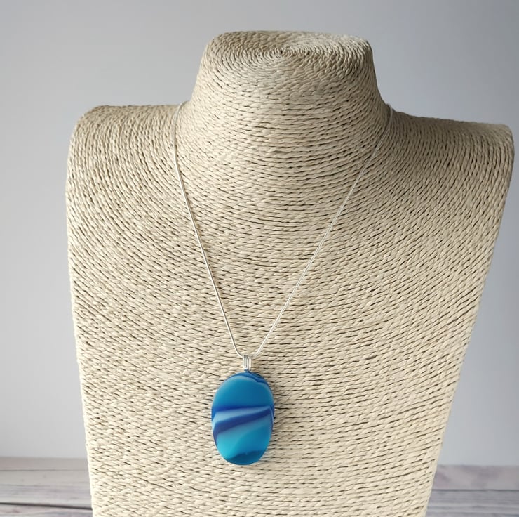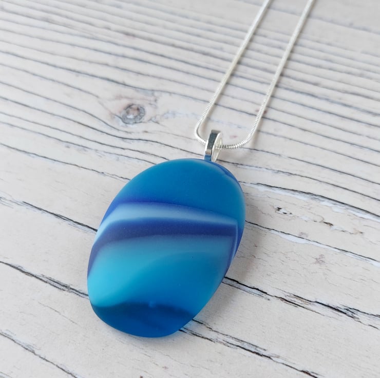 Handmade turquoise and blue striped fused glass pendant with a matt finish, created by me in my studio on the Wirral peninsula, NW England.