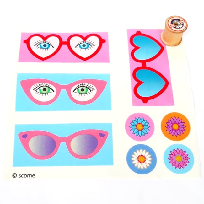 This Specs fabric panel contains 2 glasses images, 2 sunglasses images and 4 flower images which can be appliqued on to your own fabric to make glasses and sunglasses cases, see images 2 and 3 to see some cases made using this panel.