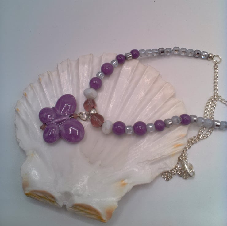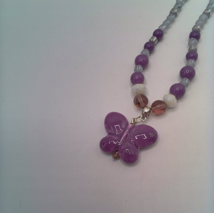 Ceramic Butterfly Pendant on a Purple Necklace, Butterfly Necklace, Gift for Her, Birthday Gift, Anniversary Gift, Mother's Day Gift, Christmas Gift, Butterfly Jewellery, Purple Necklace, Ceramic Butterfly Pendant
