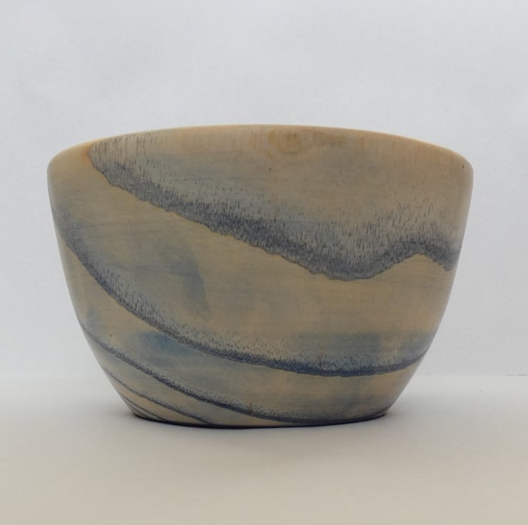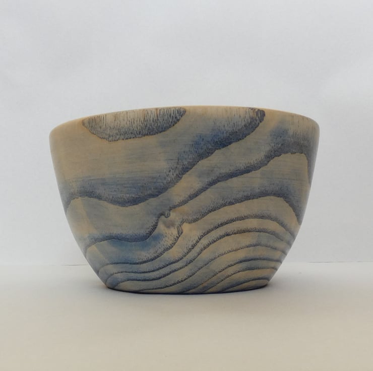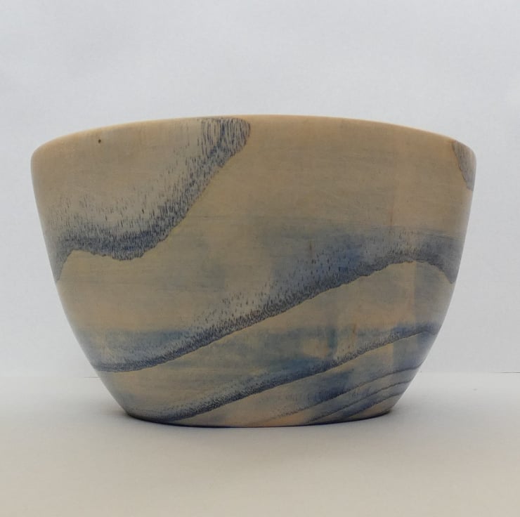 A piece of wood was selected then cut down to a suitable size to be woodturned. It was shaped on a woodturning lathe before being sanded to a smooth finish. The outer of the bowl has been woodstained in a blue colour. The bowl has been finished with a food and toy safe wax.