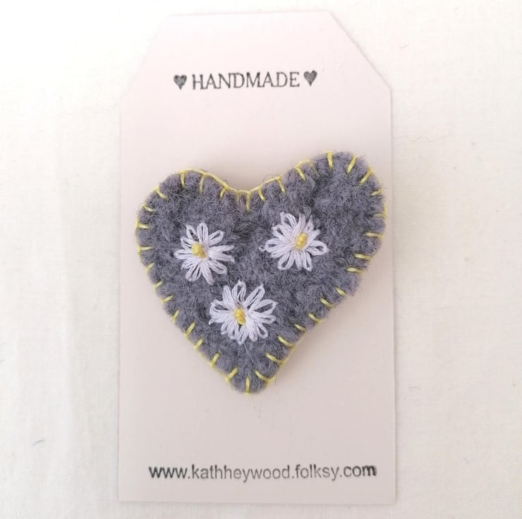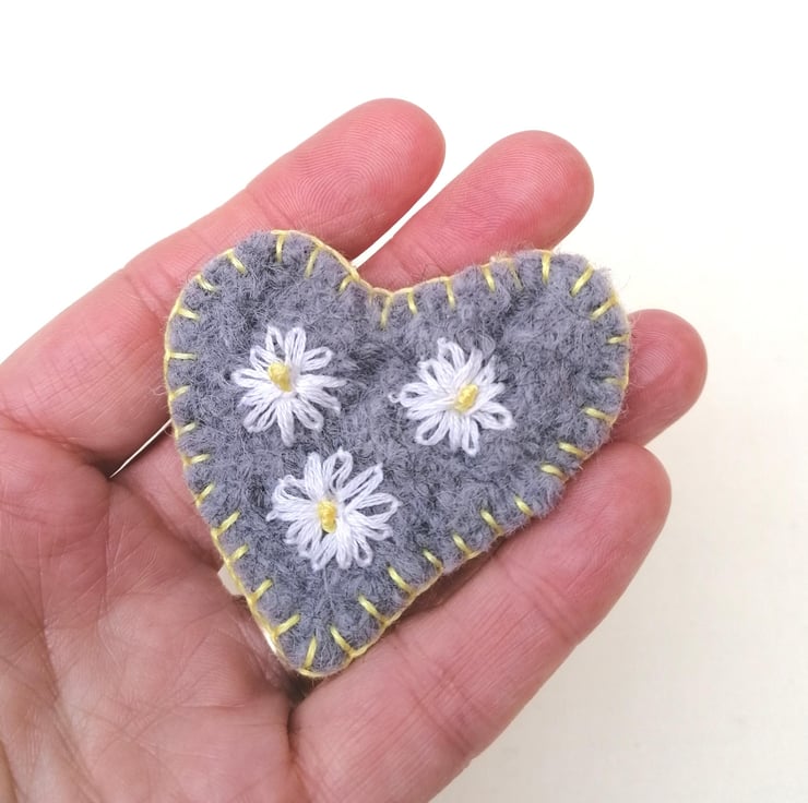 Stylish heart shaped brooch edged with yellow, hand sewn blanket stitch in embroidery thread. Adorned with 3 hand embroidered daisies. Ideal gift for a gardener.