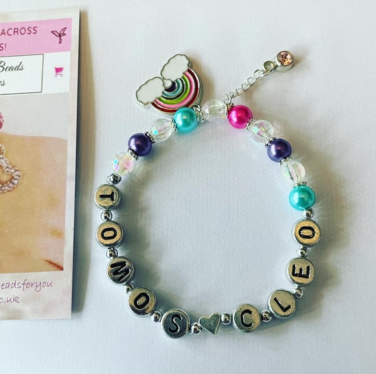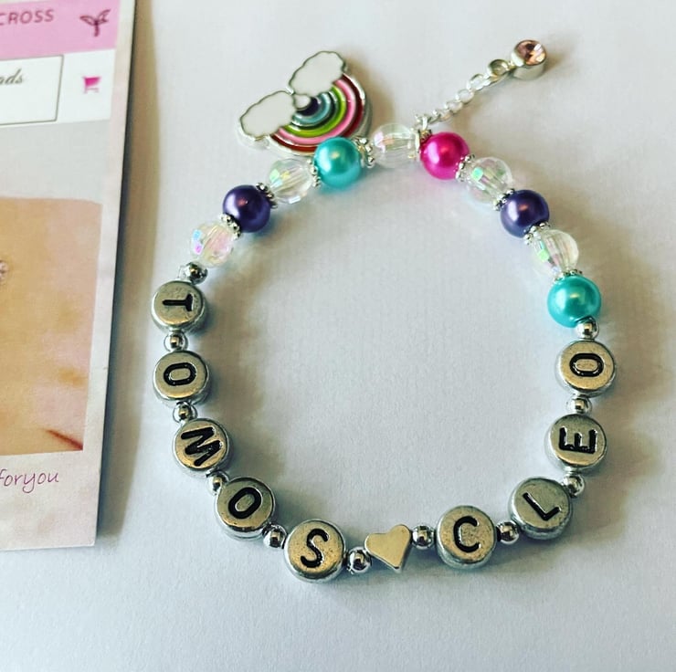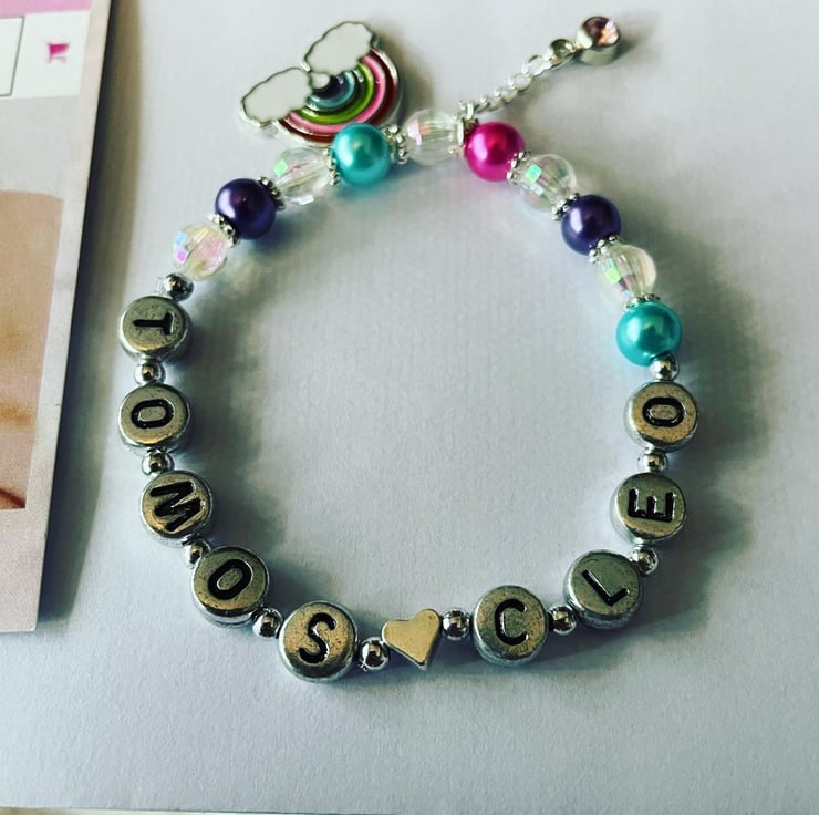 Rainbow colour and charm bracelet any two names added please be mindful longer the name the beads may vary to shown to accommodate the length