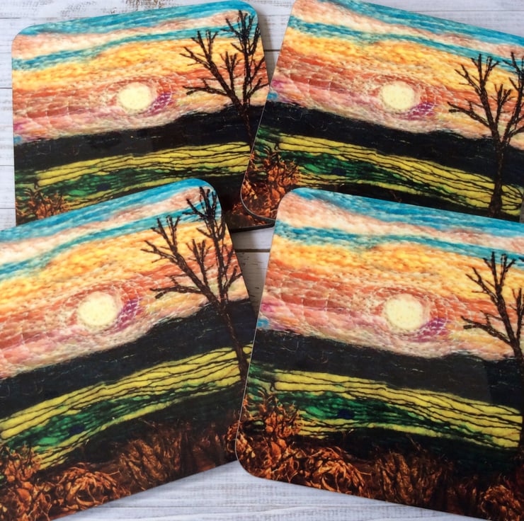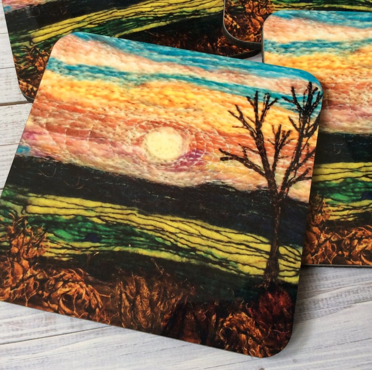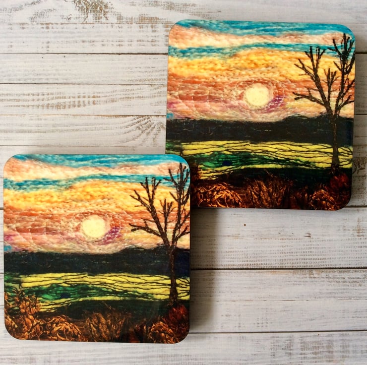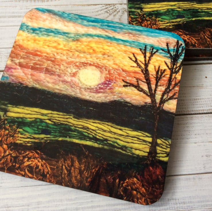 This coaster shows a print of one of my free motion embroidered sunset landscapes of Yorkshire. This one shows Malham Moor. It’s one of 12 designs that would enhance any table setting, or just sit under your favourite mug.