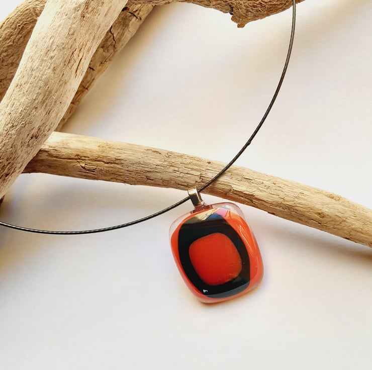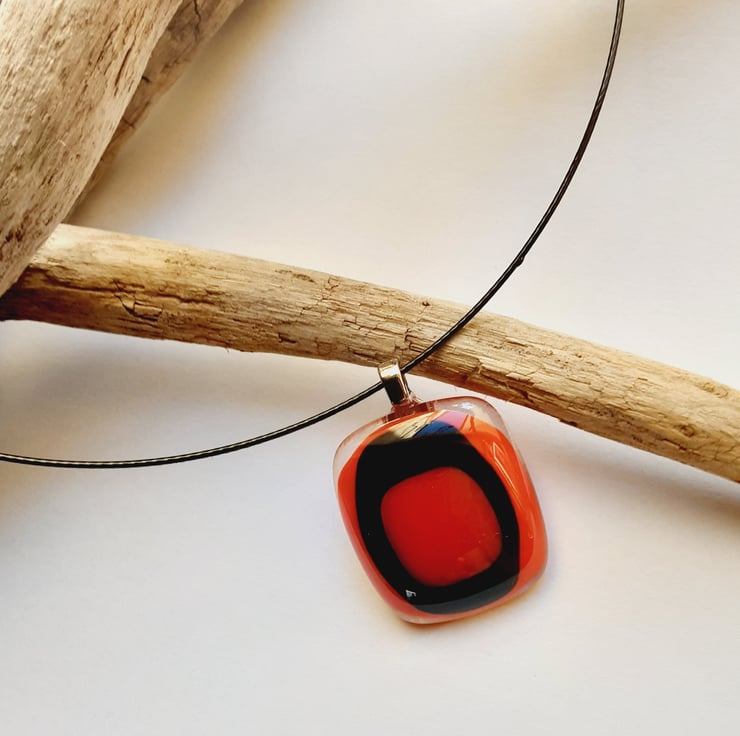 This pendant has been handcrafted by me cutting and layering small glass squares. After a full fuse, the glass cabochon has been stuck onto a silver coloured jewellery bail. It comes on a black memory wire 18" choker with a magnetic clasp.