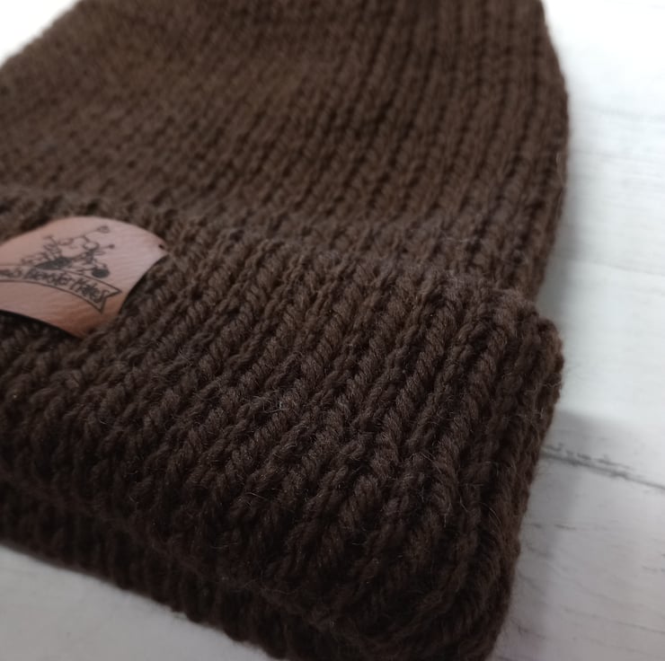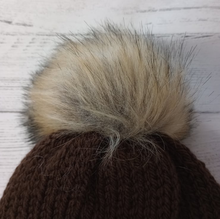 This is a chocolate brown coloured beanie with a brown/tan fake fur pompom. Made double thickness in worsted yarn, just like the TikTok Beanies you may have seen on the popular social media platform! Can be worn with the brim folded over as in the pictures, or as a slouch style hat without the brim folded.