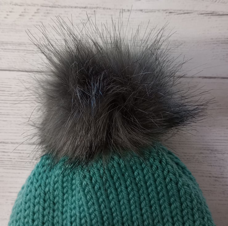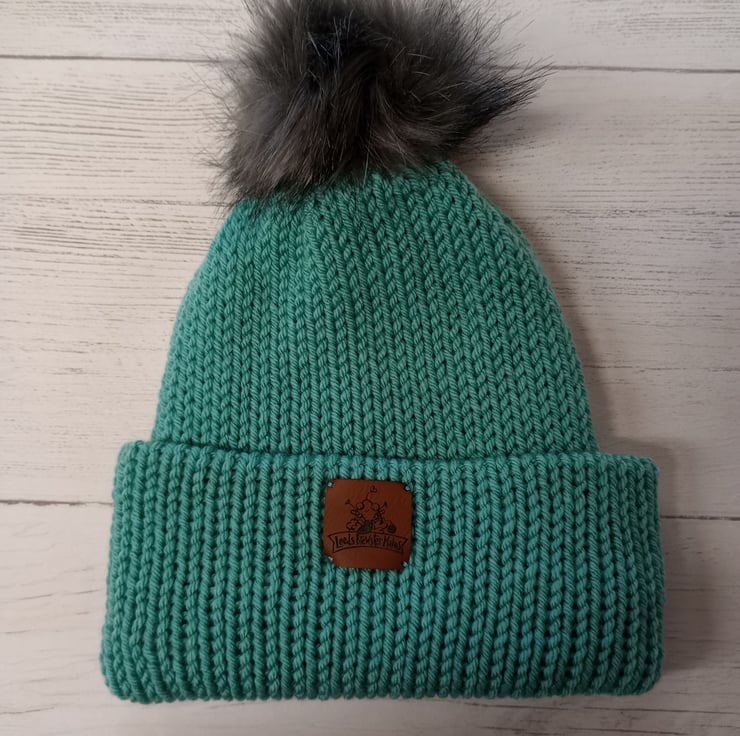This one of a kind hat is blue-green with a grey fake fur pompom. Made double thickness in worsted yarn, just like the TikTok Beanies you may have seen on the popular social media platform! Can be worn with the brim folded over as in the pictures, or as a slouch style hat without the brim folded.