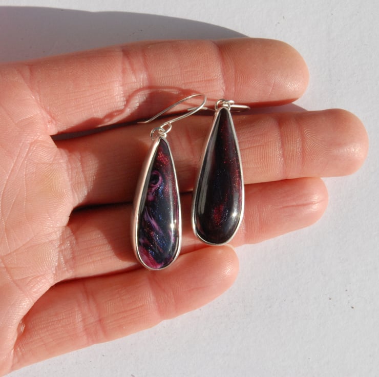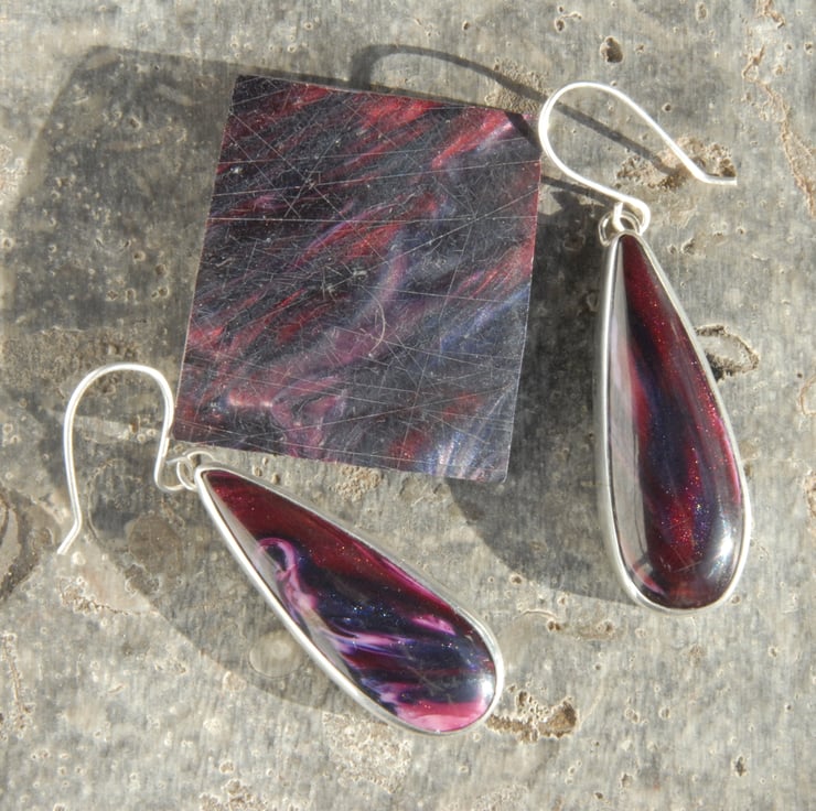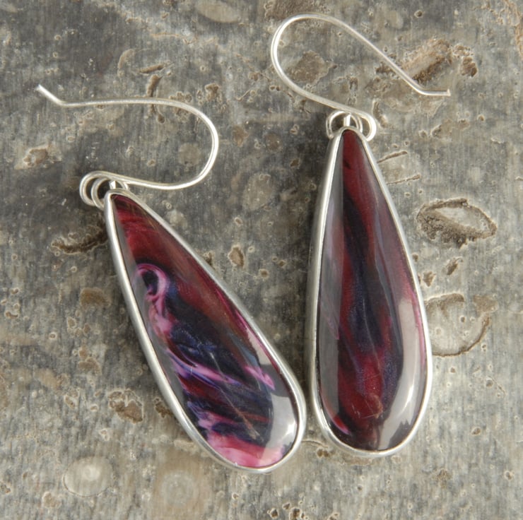 These classic drop earrings feature shimmery bowlerite bezel set in sterling silver, the bowlerite is a deep cherry red colour with shimmers and swirls in paler raspberry pink, navy and lilac. The earrings are finished with simple hooks (let me know if you'd prefer kidney wires and I'll swap them over). Measures approx 45 by 13mm, (inc hooks). Comes in a gift box.