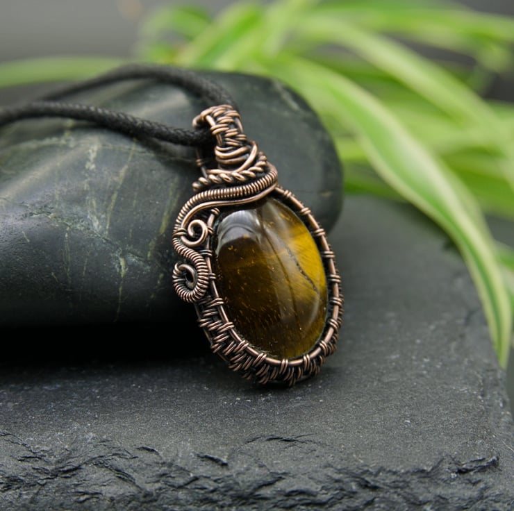 This stunning, one-of-a-kind, wire wrapped pendant features a beautiful golden brown Tiger’s Eye cabochon. I’ve wrapped the stone with a band of woven copper wires which then form a simple bail. The pendant has been finished with bare, wrapped and twisted wires which loop around the neck, swirling down to the side of the pendant with little spiralled details. The intricate wire wrapping secures the stone perfectly and really shows off the wonderful cat's eye effect of the Tigers Eye.