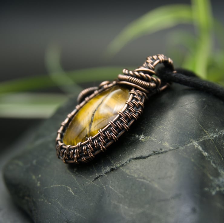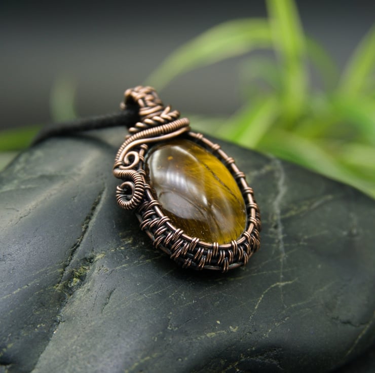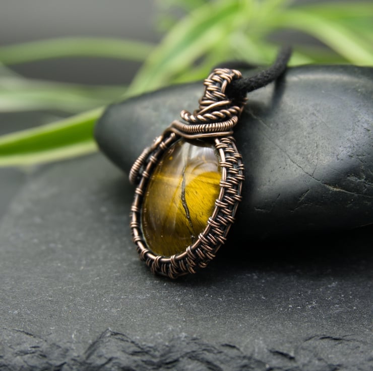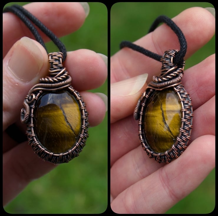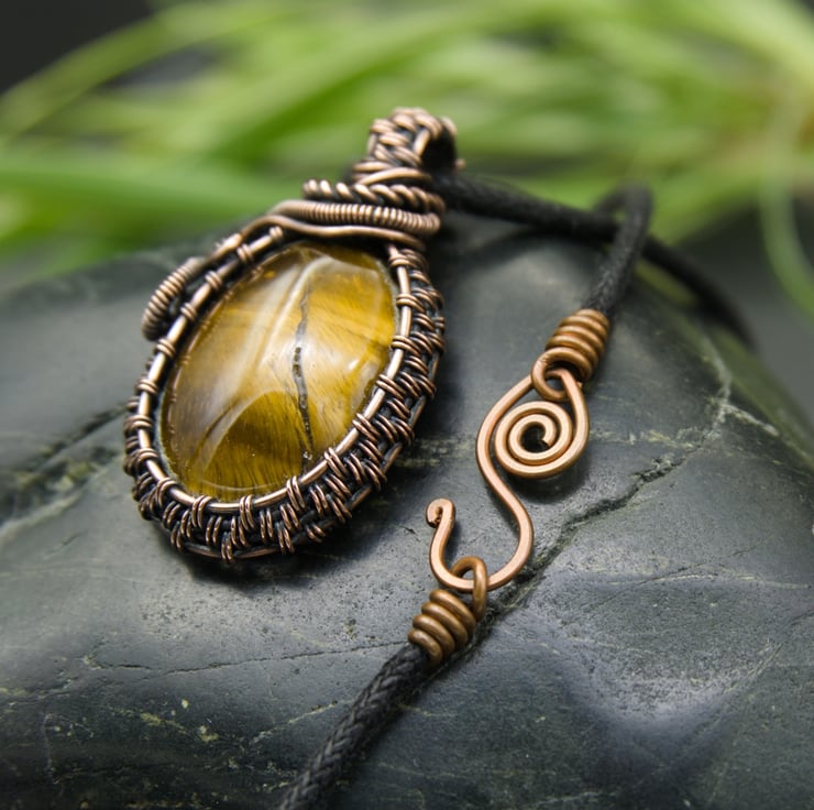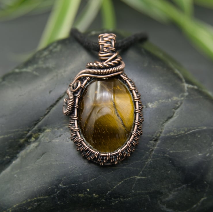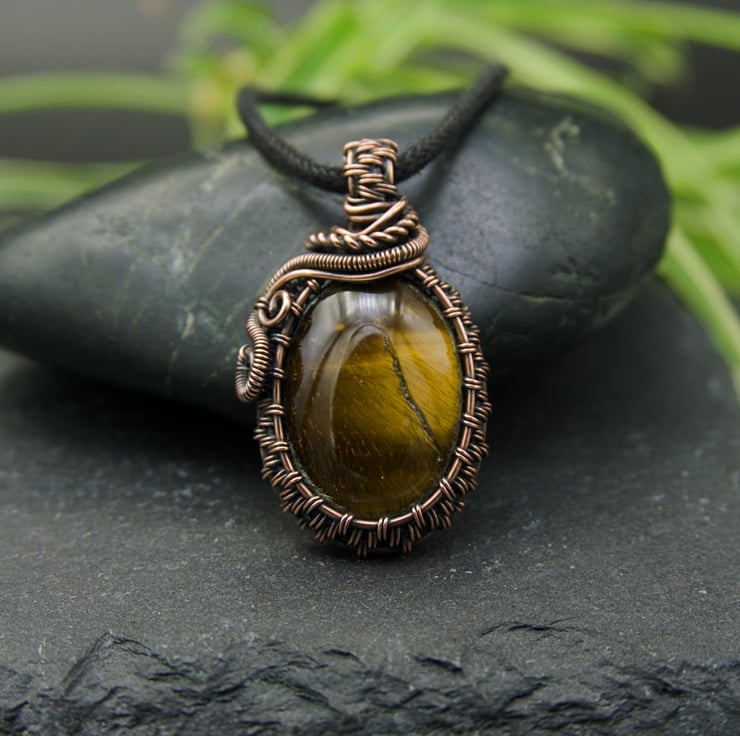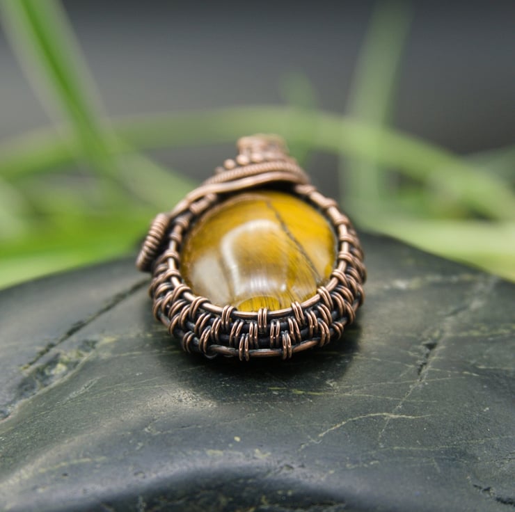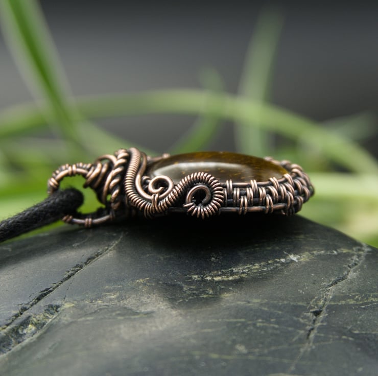 I've oxidised the finished pendant & lightly polished it to really pick out the details of the wire weave. The antiqued copper colour in turn really brings out the golden tones of the Tiger’s Eye! The cabochon is a darker gold-brown colour when viewed from one side, whereas from the front or other side the brighter gold colours flash through. The cabochon does contain a line which runs across the front of the stone - it is not a crack but an internal fault line (i.e. cannot be felt from the outside).