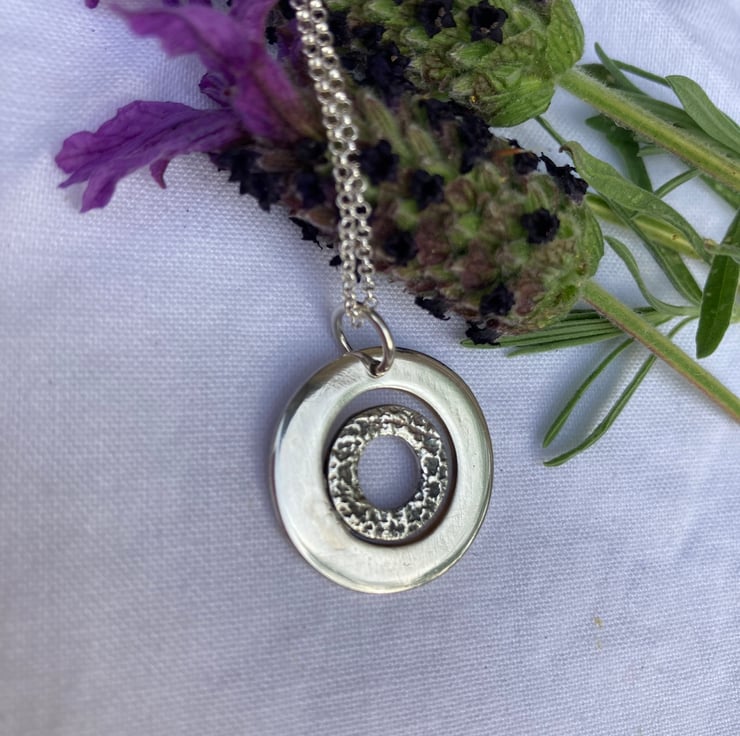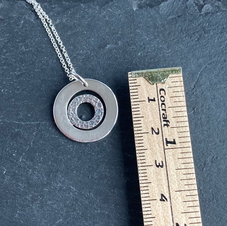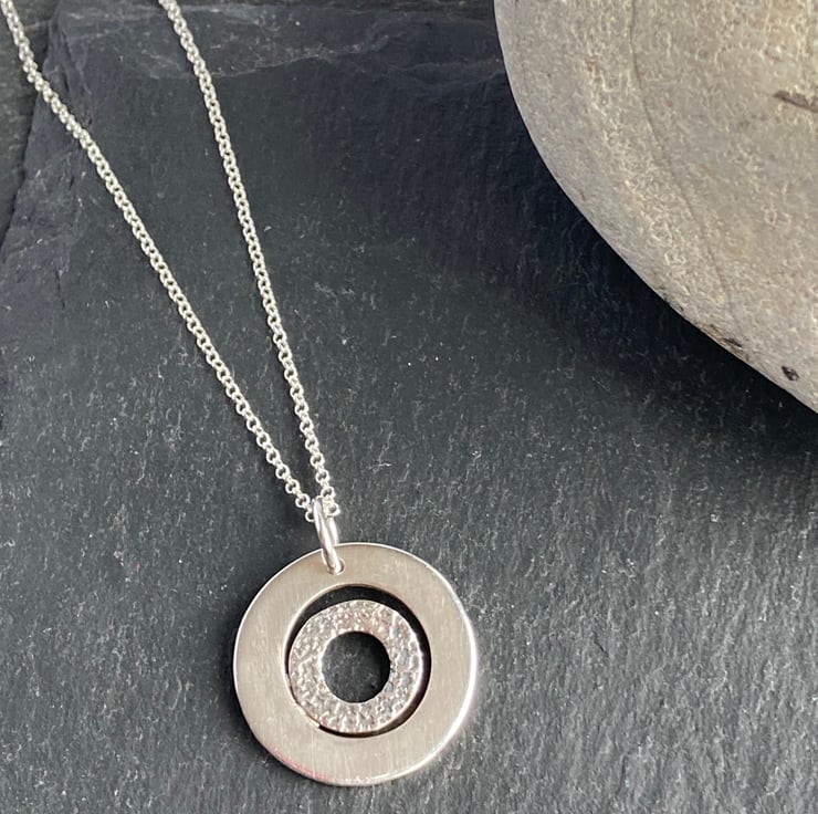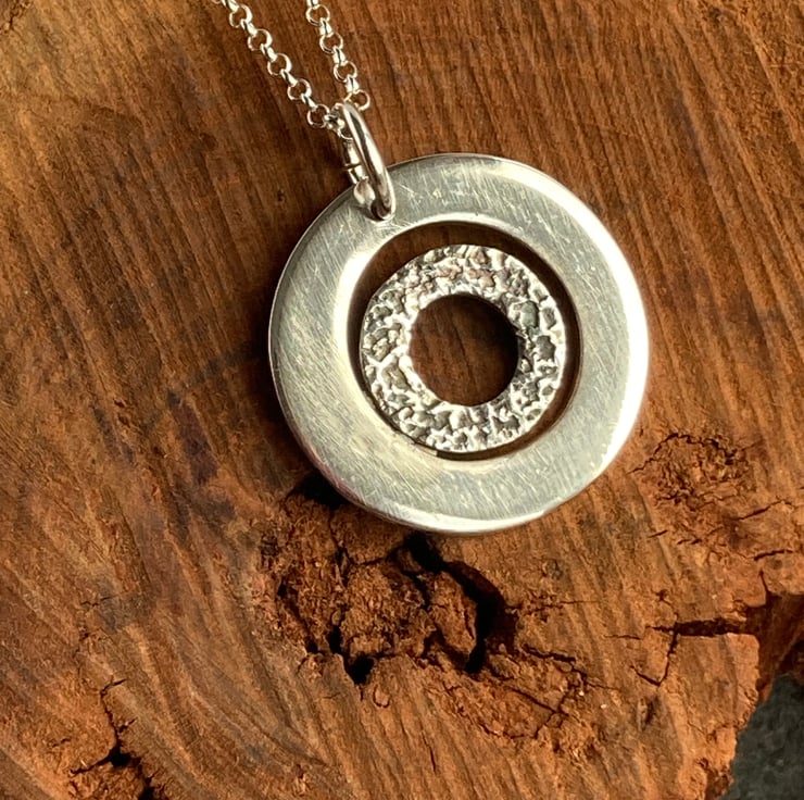 This pendant has a textured circle hoop set within a shiny bigger circular hoop. The inner circles texture has been oxidised to bring out the features of the circle.