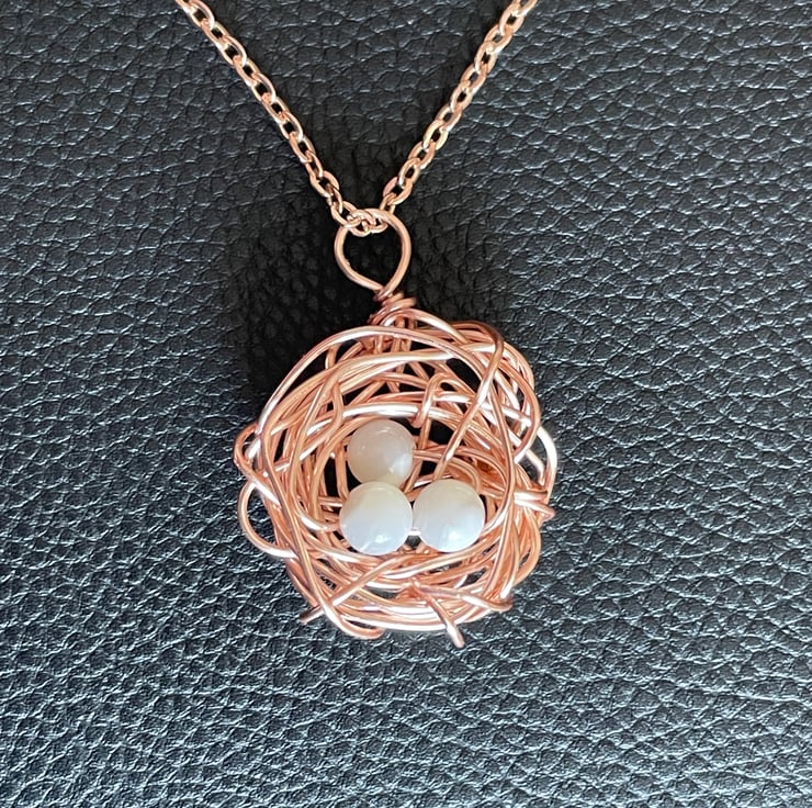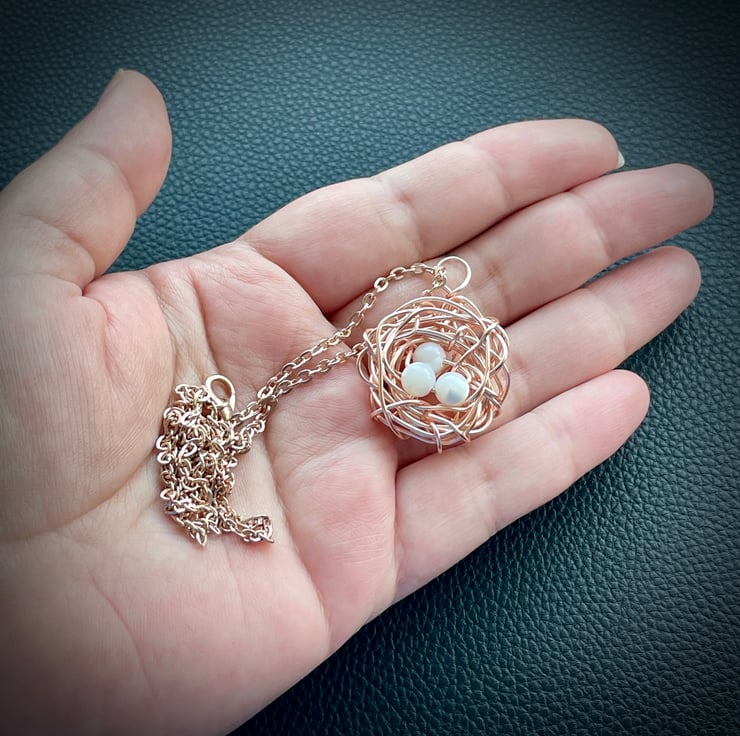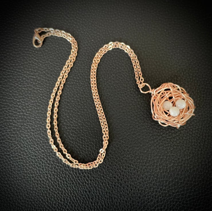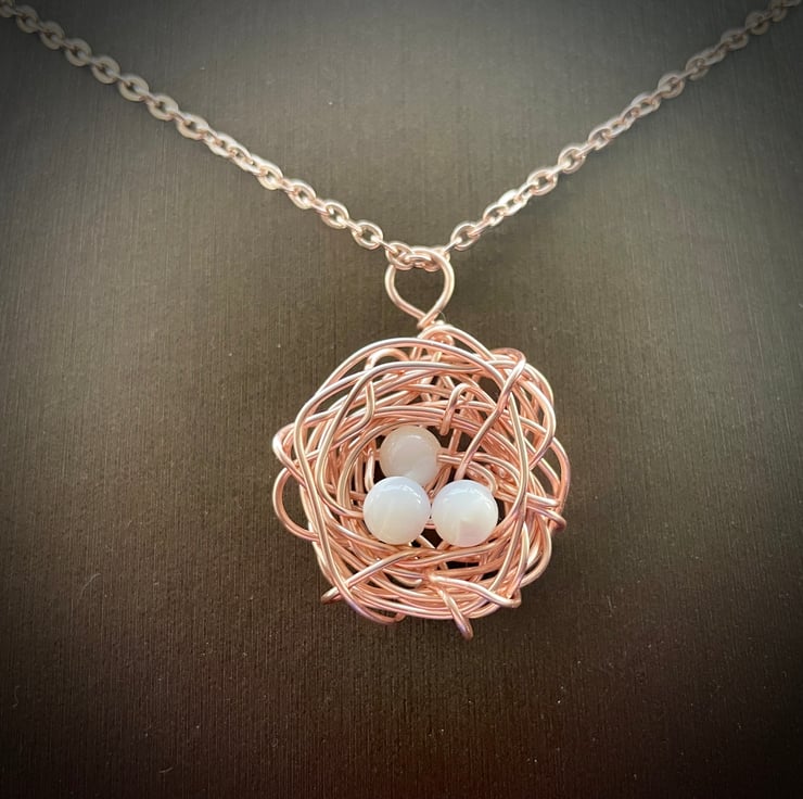 Created by hand using a rose gold coated length of artistic copper wire and paired with a 21 inch rose gold tone chain, I added three beautiful mother of pearl beads for eggs in the centre of the nest.