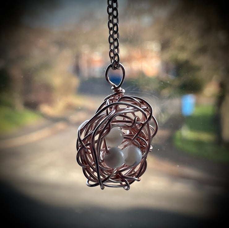 Handmade Wire Wrapped Rose Gold Copper & Mother of Pearl Birds Nest Pendant is a wonderful alternate to a chocolate egg this Easter. Measuring 3x4cm