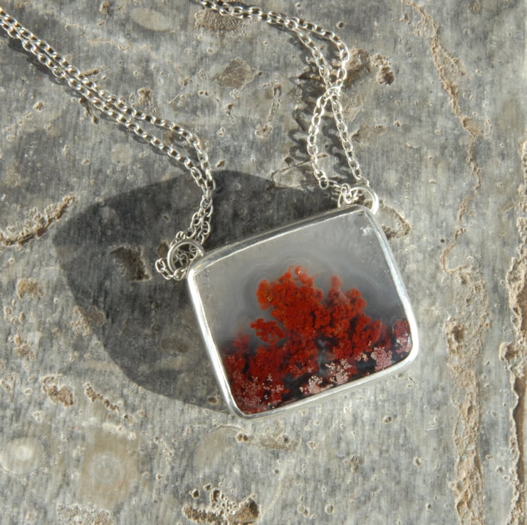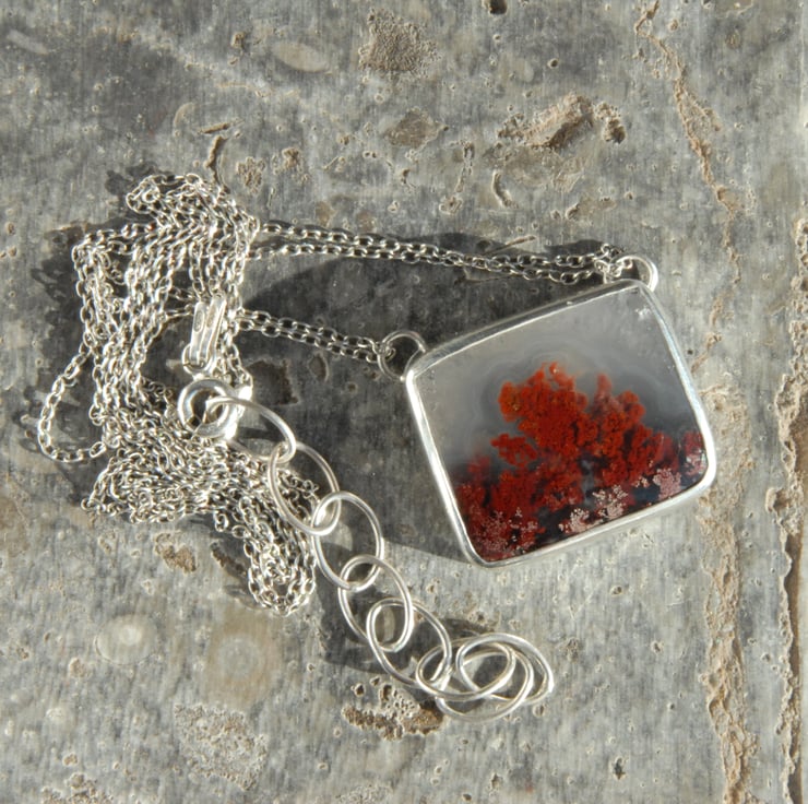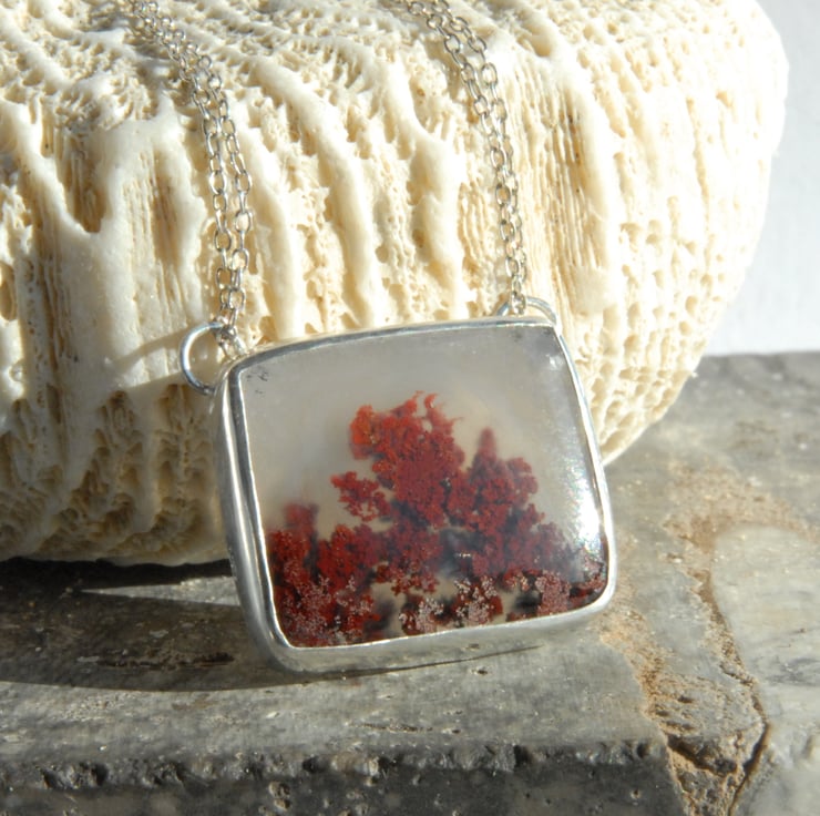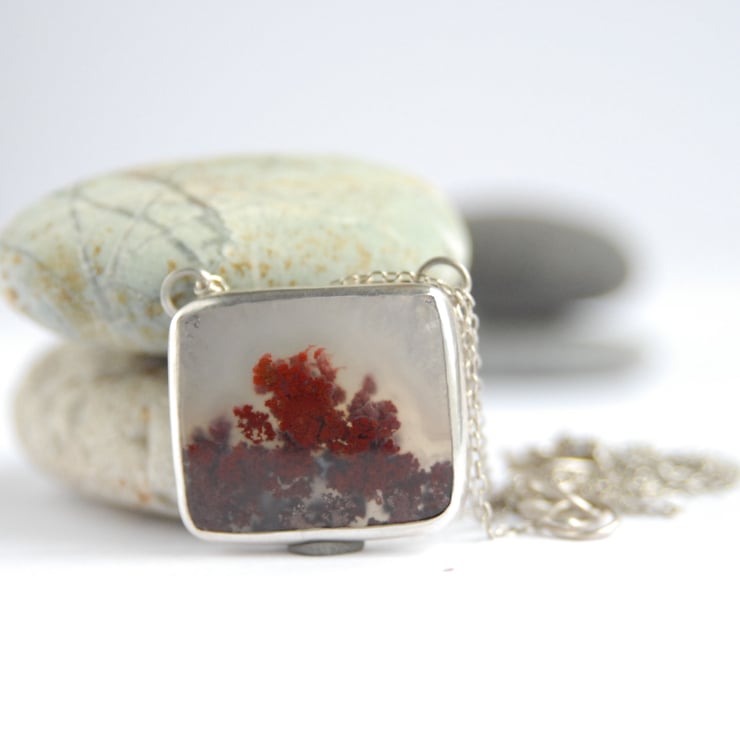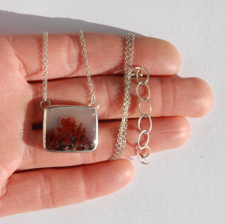 This minimalist necklace features an oblong of moss agate smoothly bezel set in sterling silver, it hangs within a sterling silver chain complete with an extender. The agate has reddy brown 'moss' inclusions erupting like a plume from the lower edge of the pendant making a mini scene, the plume contrasts against the translucent white background. This particular moss agate came from Indonesia. The chain is a double strand of fine trace chain, delicate but robust enough to carry the stone.