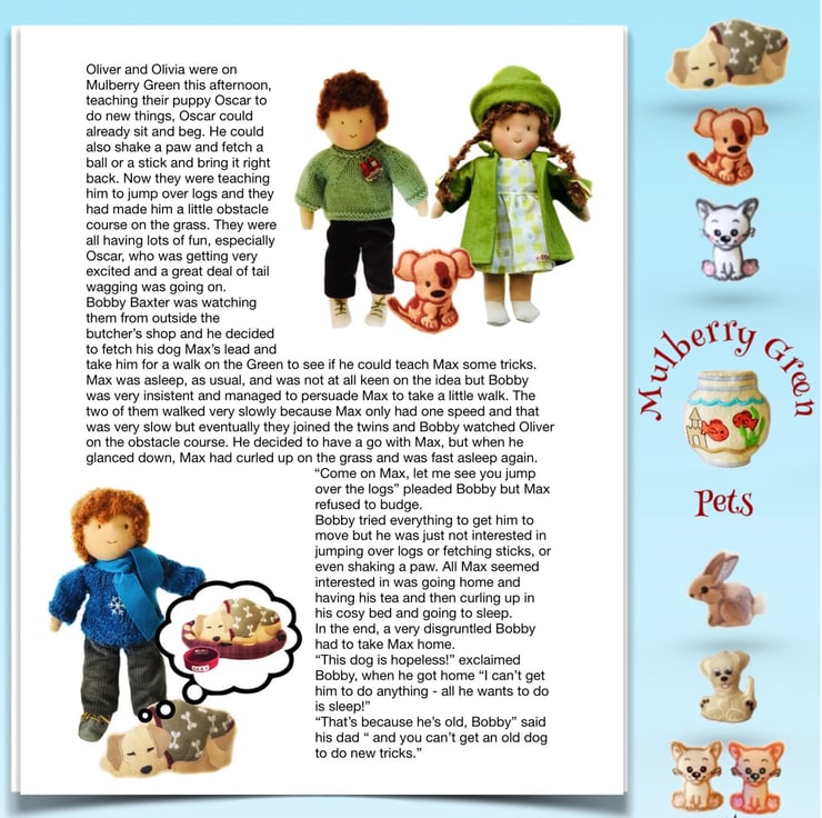 There are other children in Maisy’s class at school - Violet, Billy with his pet rabbit, Amber, Tilly, Rosie and her kittens, Amelia, Ruby, Marigold, Bobby with Max the dog, and the twins Oliver and Olivia, who have a puppy called Oscar. The dolls are all 28cm tall and baby Daisy is 16cm. Maisy and Mo love nothing more than having adventures with their friends. You can read about their adventures on my Facebook and Instagram pages - Maisy Muffin Rag Dolls and on my Mulberry Green Pinterest boards.