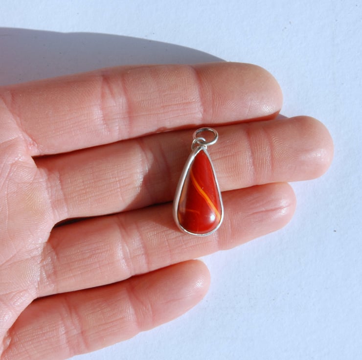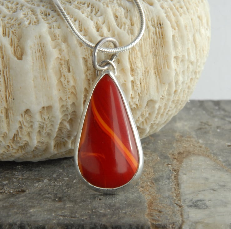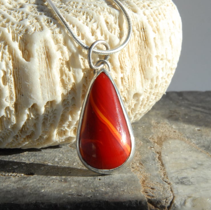 This eye catching pendant is a piece of bright red Fenton glass bezel set in sterling silver and finished with a simple (but generous) loop bail. The Fenton glass has a simple tear drop shape but is the red colour of ripe tomatoes (its a deeper red than in the photos) with a stripe of orange to make it really stand out. Fenton glass is waste glass found a the site of an old factory - Fenton Art Glass in USA - which a friend cuts and polishes into cabochons, because it is waste glass it often has random swirls and bands of disparate colours depending on what they were making.