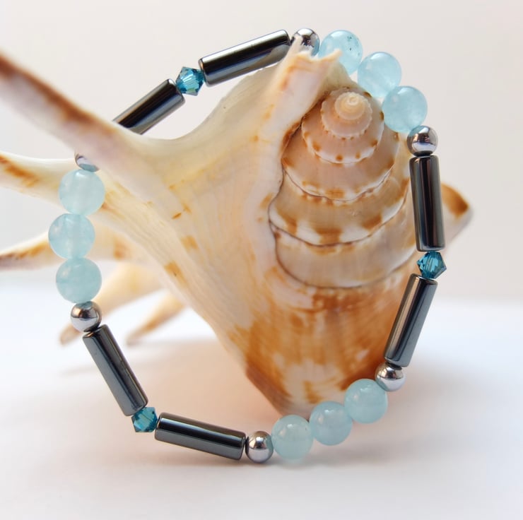 Hematite tubes measuring approximately 4mm x 13mm and 6mm aquamarine jade rounds are embellished with Swarovski crystals in a colour called "indicolite" and 4mm silver hematite to add sparkle and shine.
