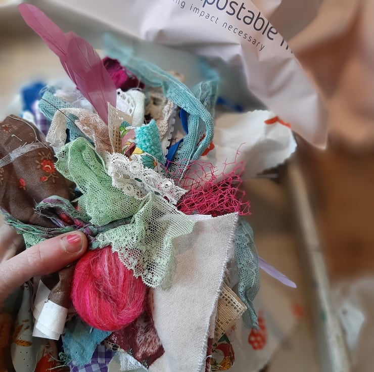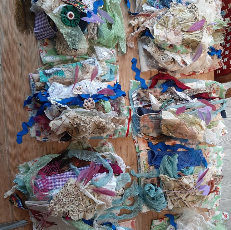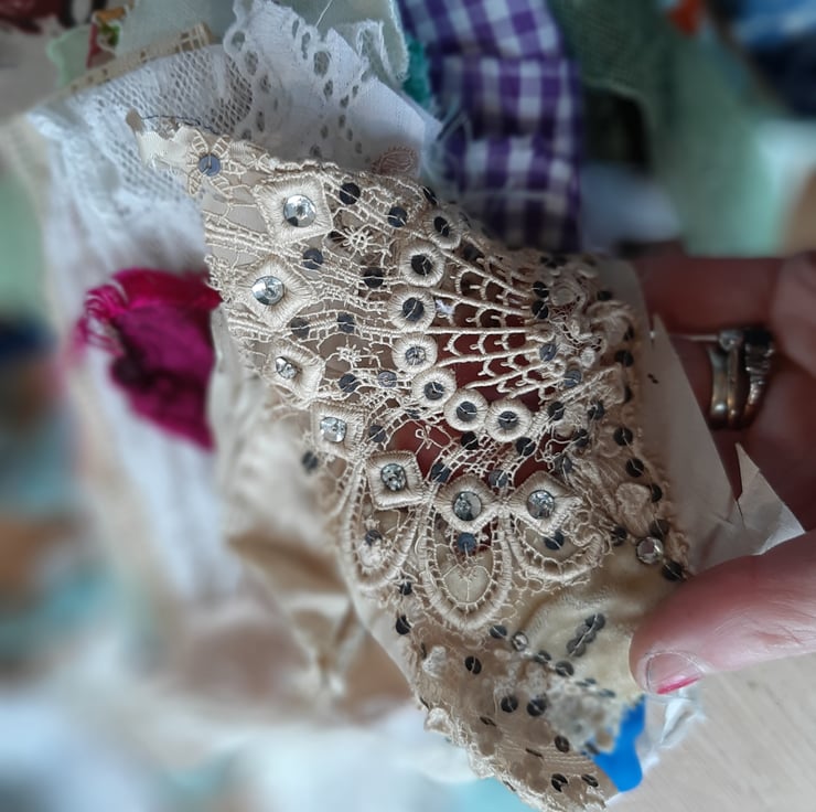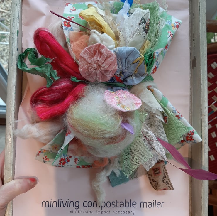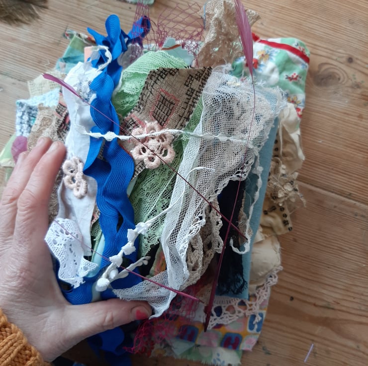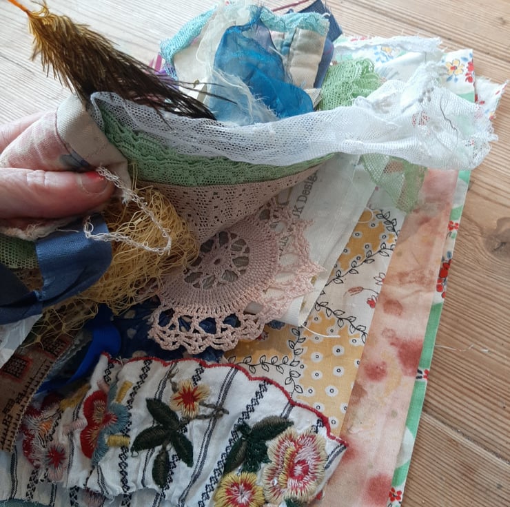 Beautiful bundles of textiles. For you crafty folk. Some bits of edwardian lace , merio wool. 1940s fabric, feather, trims, a real collection of textures .comes in a compostable postage bag. Reduce reuse recycling. Love to see what you make x