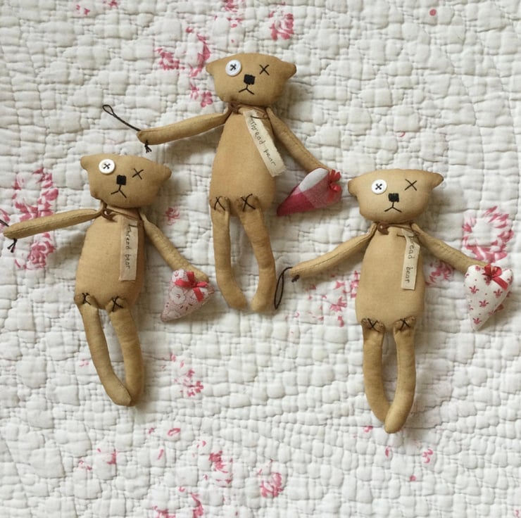 Each bear is made from tea/coffee stained cotton to give them an aged appearance. The limbs are attached with X-stitch and the facial features, with one pearl button, are also hand stitched.