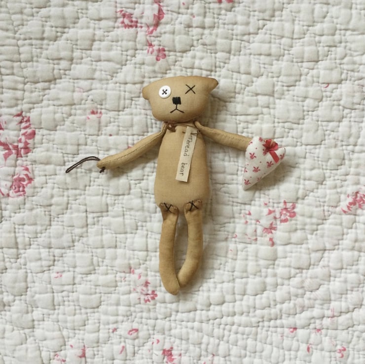 Thread bear is holding a small heart made from vintage fabric and trimmed with a silk ribbon bow.