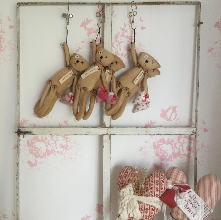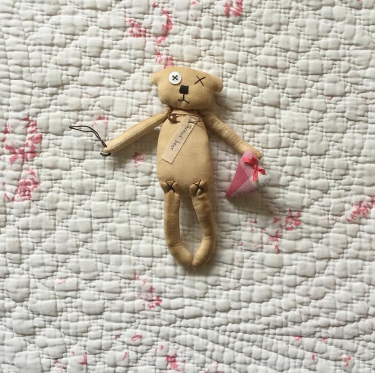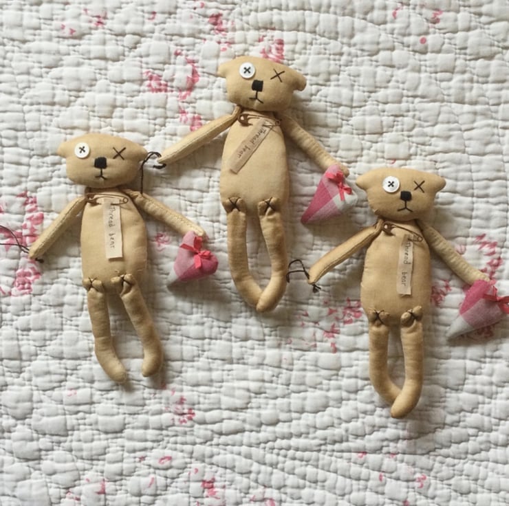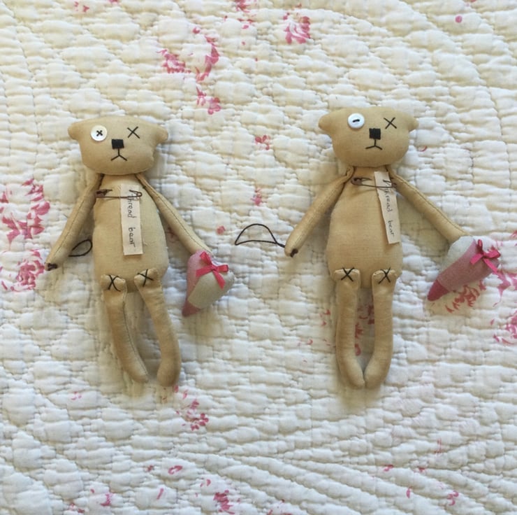 Each bear is made from tea/coffee stained cotton to give them an aged appearance. The limbs are attached with X-stitch and the facial features, with one pearl button, are also hand stitched.