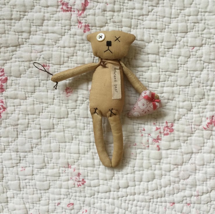The 'thread bear' label is attached with a rusty safety pin. There is a small contrast vintage quilt patch on the back.