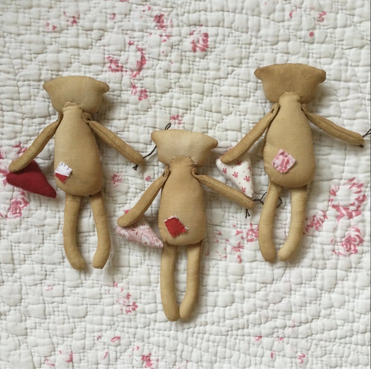Each bear is made from tea/coffee stained cotton to give them an aged appearance. The limbs are attached with X-stitch and the facial features, with one pearl button, are also hand stitched.
