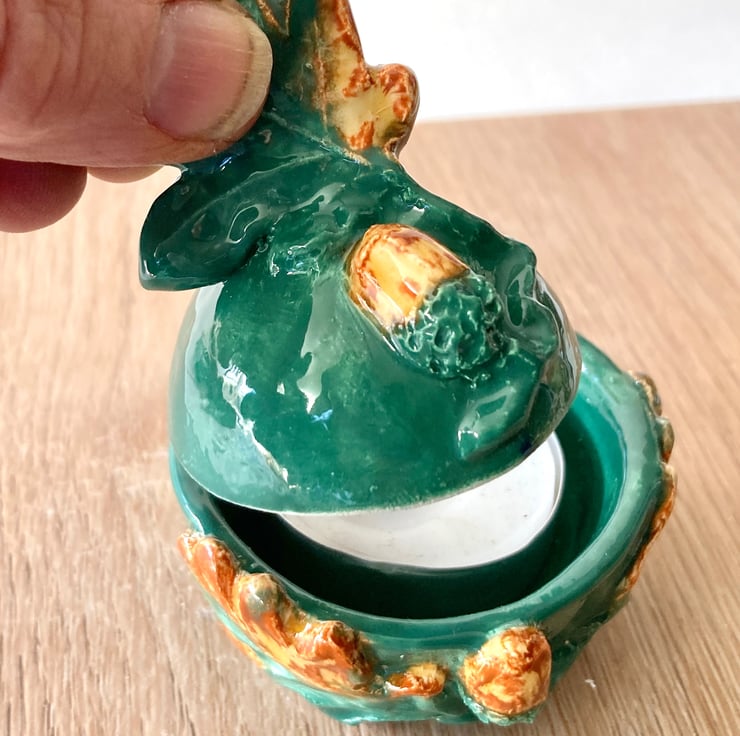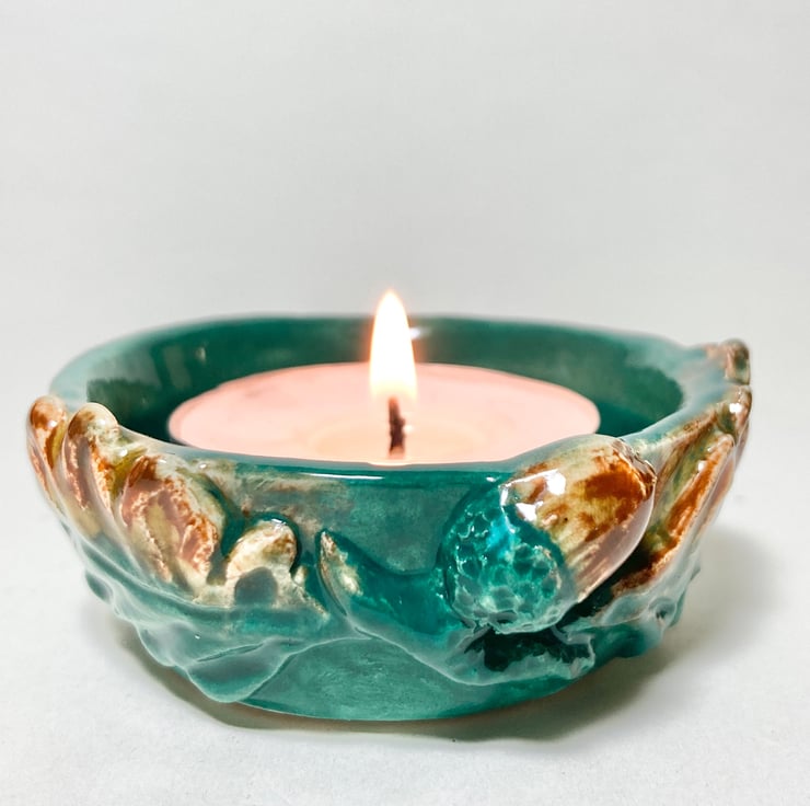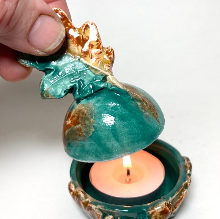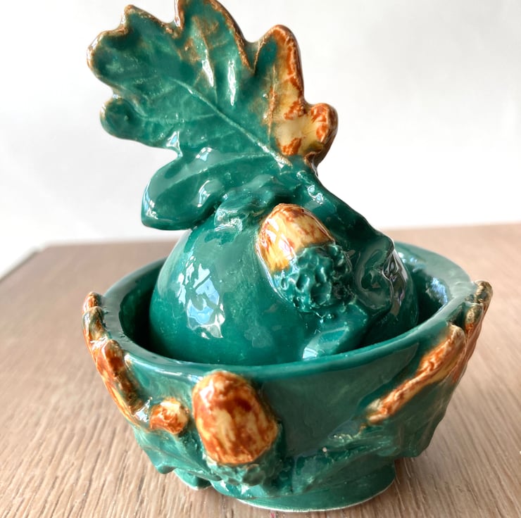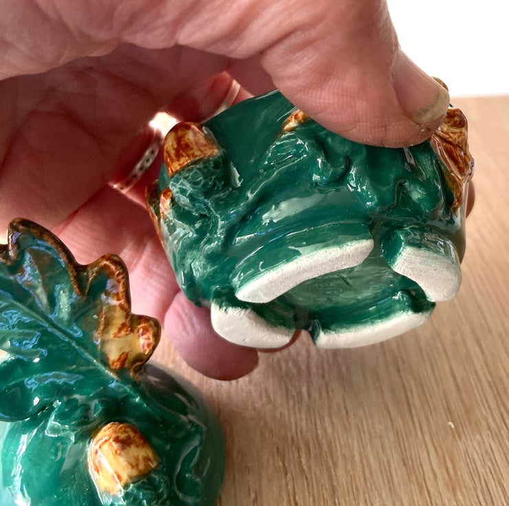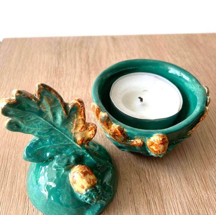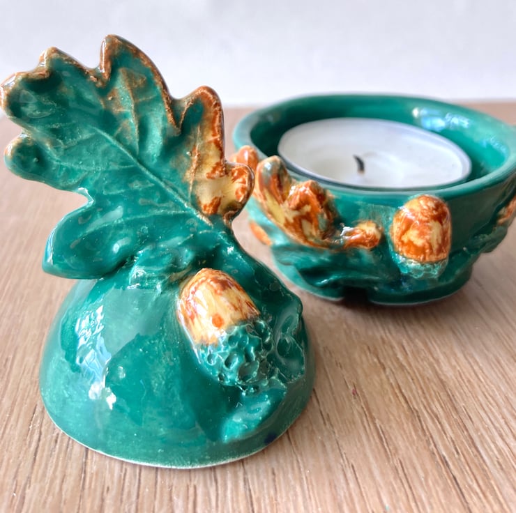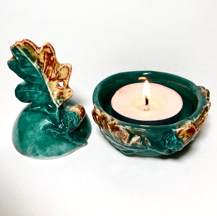 This little ceramic dish is hand decorated , the perfect size for a tea light has an oak leaf and acorn modelled design, with little feet to protect surfaces.. Teamed up with a matching oak leaf candle snuffer to make a unique gift for anyone.