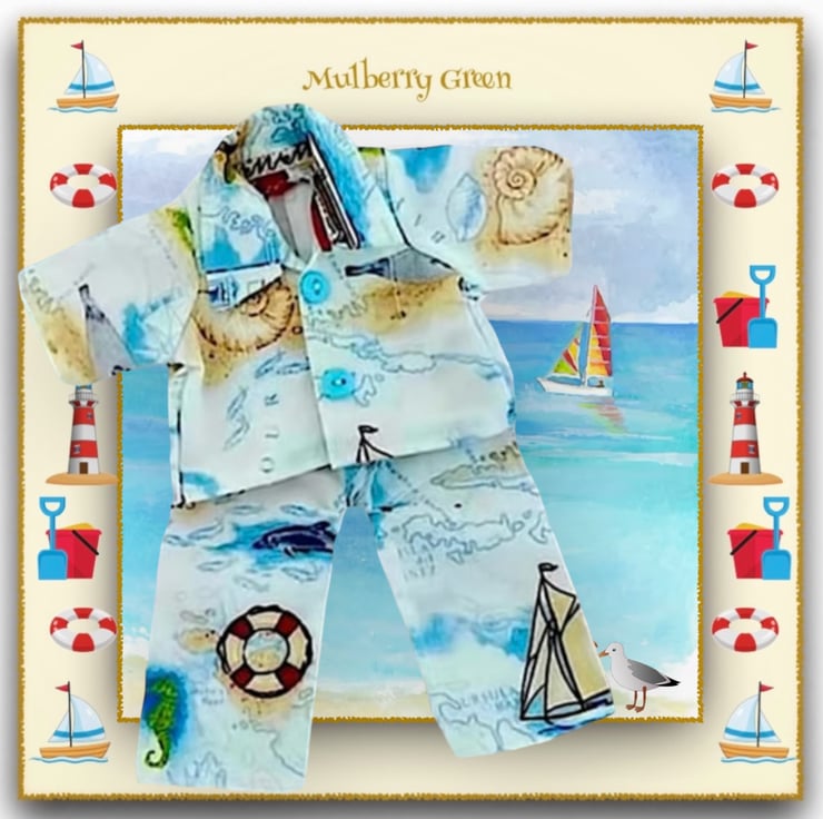 A cute little pair of coastal print pyjamas to fit the Mulberry Green characters. The pyjamas are made from cotton and are tailored like real pyjamas. They fasten with poppers under two little buttons.