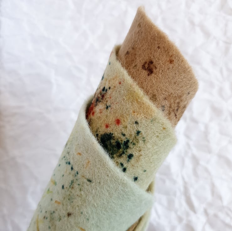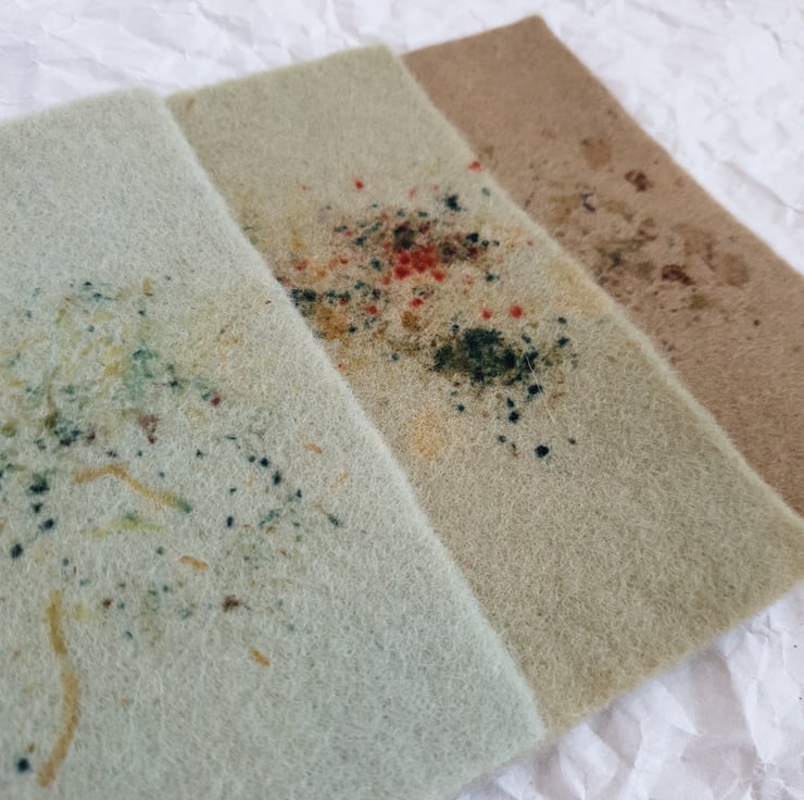 100% wool felt sheets in four shades hand-dyed in using natural materials. The speckles are in colours that vary, yet complement each other.