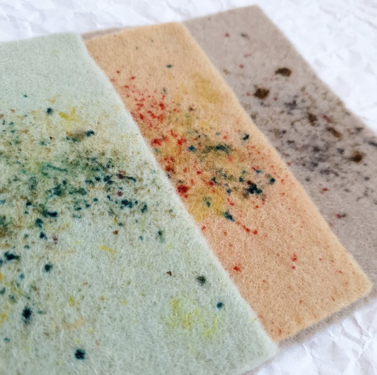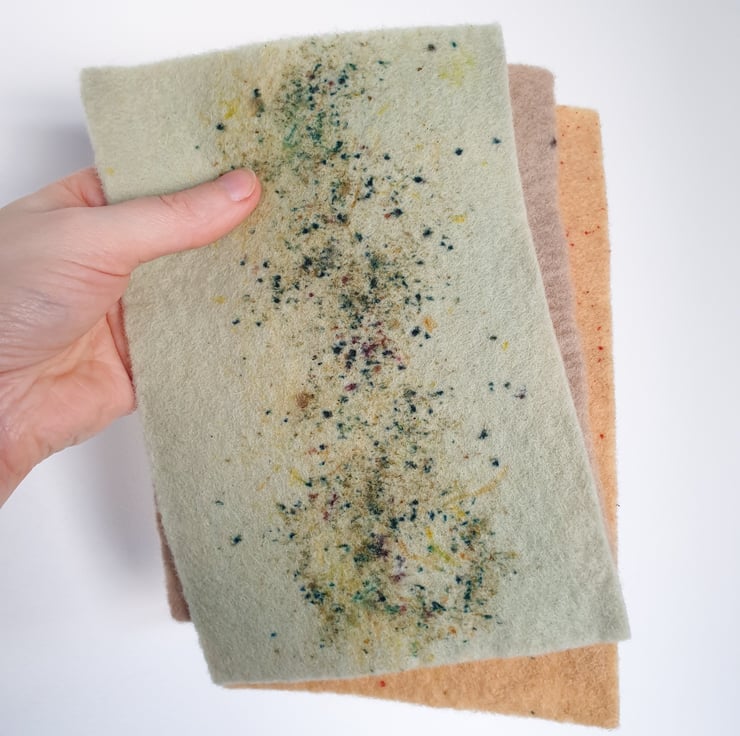 100% wool felt sheets in four shades hand-dyed in using natural materials. The speckles are in colours that vary, yet complement each other.
