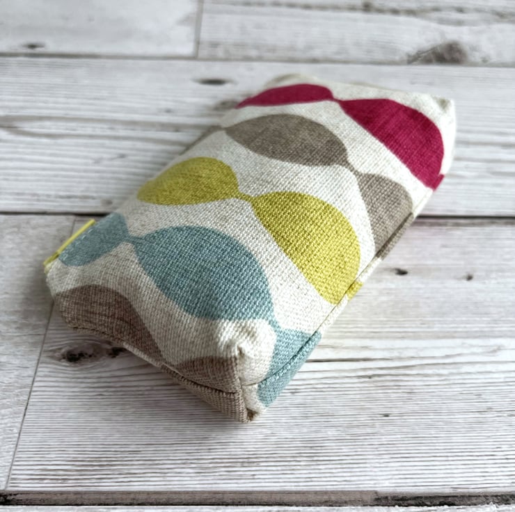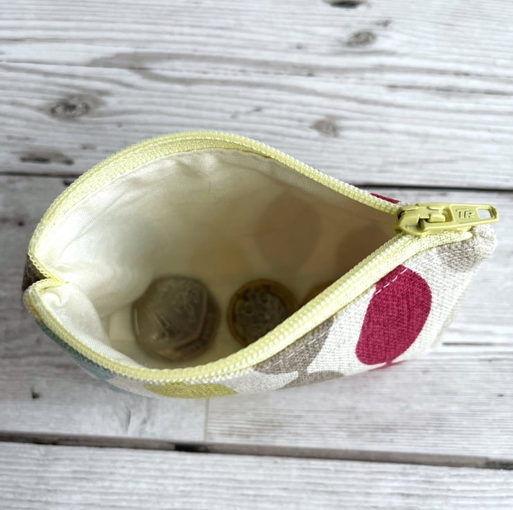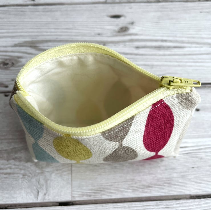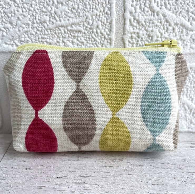 A small coin purse with bright oval stripes. This vibrant little purse is made from a striking print fabric with a pattern of bright ovals in stripes on a cream background. The oval stripes are in lovely summery shades of yellow-green, magenta, pale blue and beige. The coin purse has a pale yellow zip and is lined with cream fabric. The base of the purse is boxed to give more space inside.