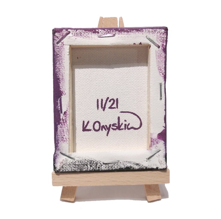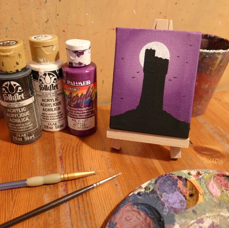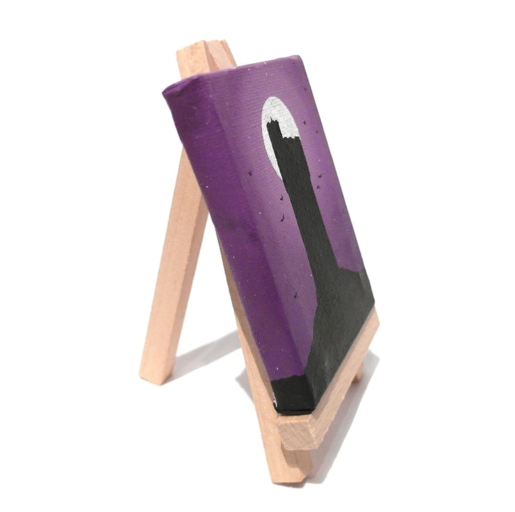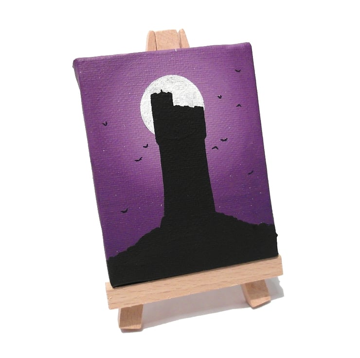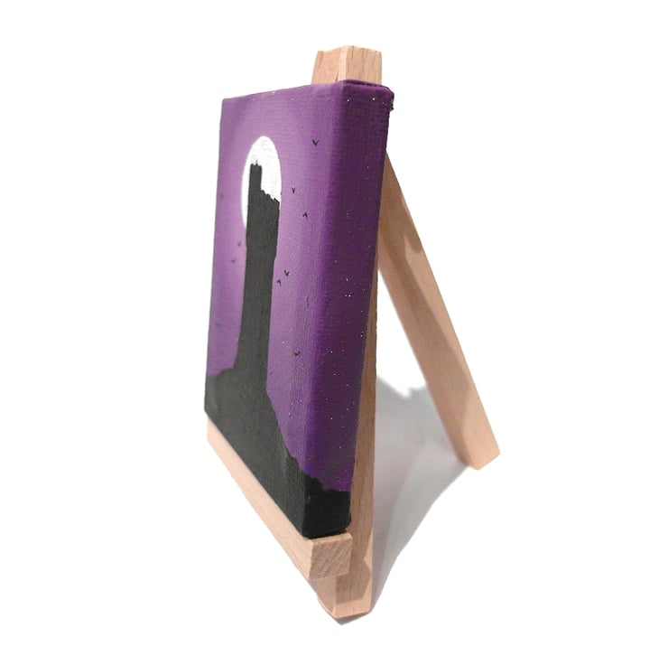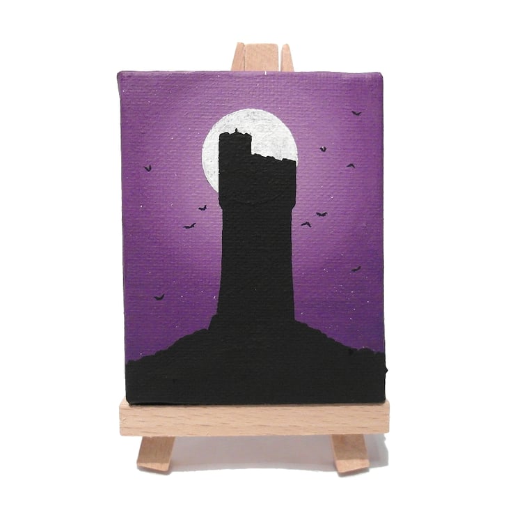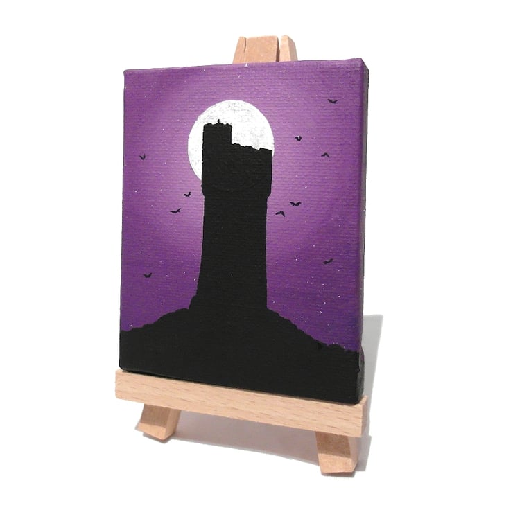 The spooky Castle Hill scene is painted in acrylics on a 7cm x 9cm mini canvas, and as the canvas is so small it has been signed and dated on the back. The original painting will come with a 12cm (4.7") wooden easel for display.